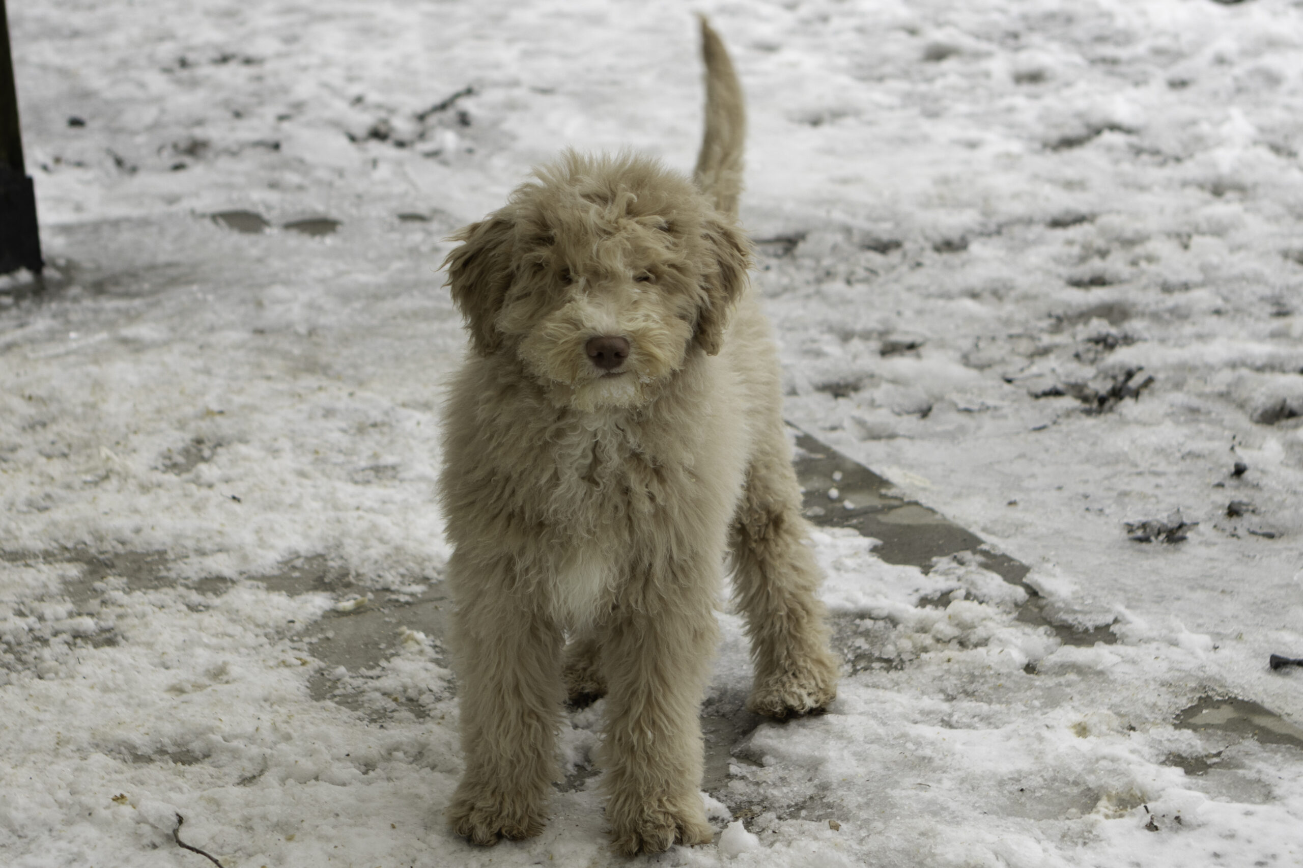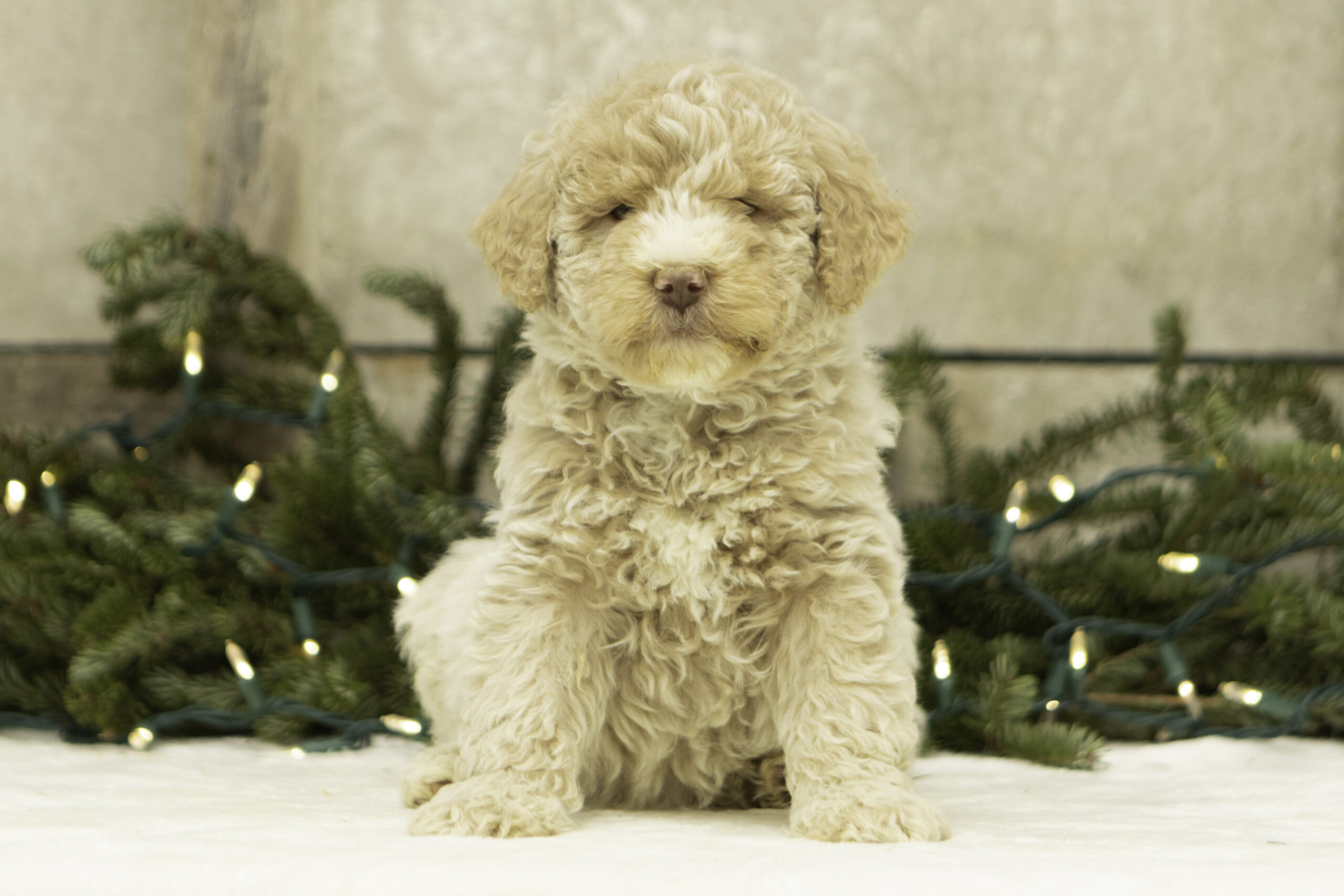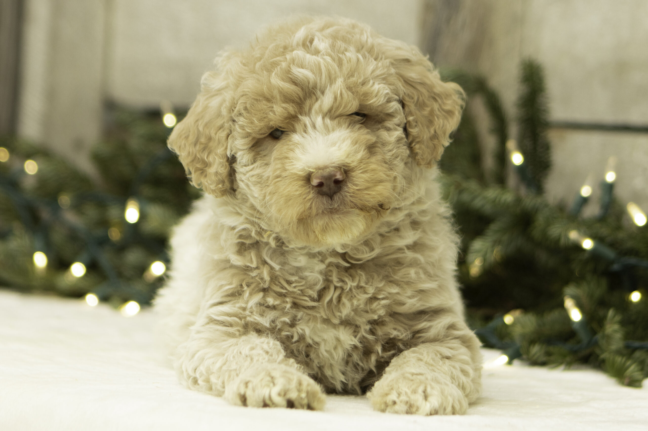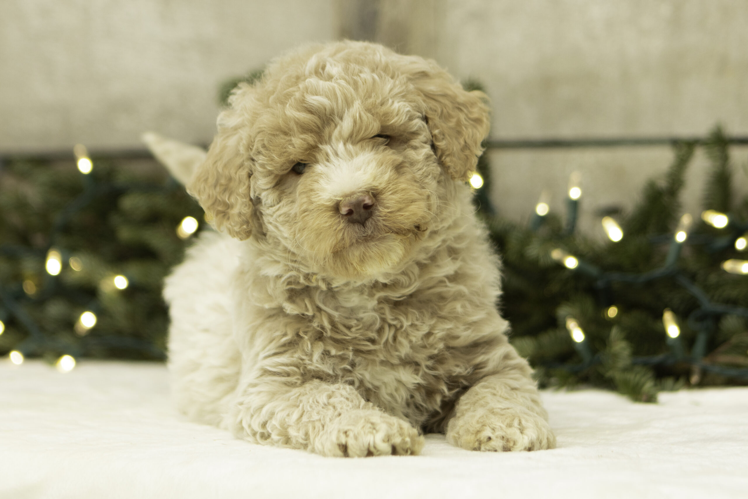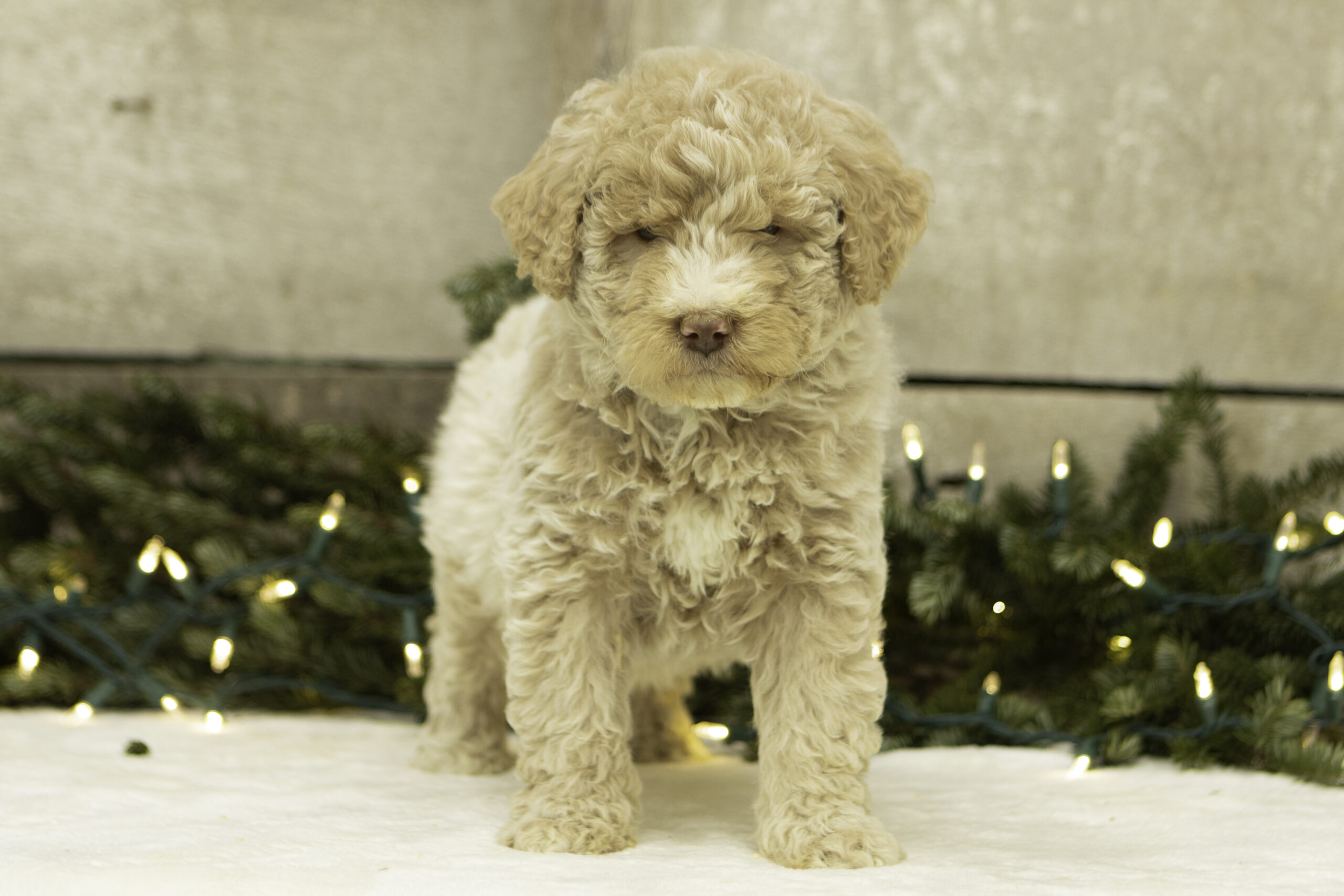 Finn is a 41lb Poodle with a gentle, thoughtful spirit. While he may come off as a bit reserved at first, his quiet curiosity quickly shines through. Once he’s comfortable, Finn reveals his sweet and loving nature. He’s a calm and steady companion who brings a balanced temperament to our program. With his refined build and kind personality, Finn is a wonderful sire who consistently passes down his soft nature and intelligence to his puppies.