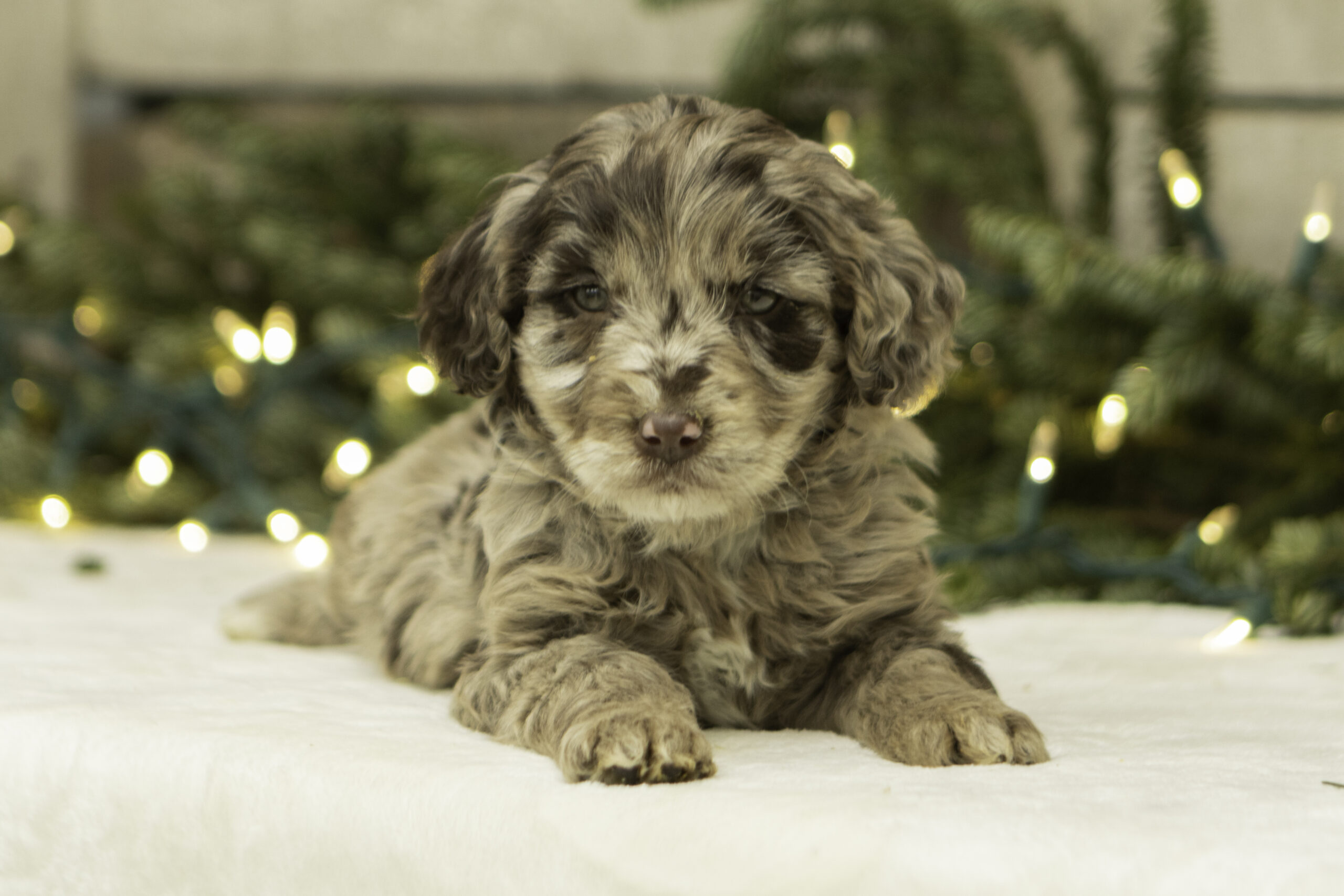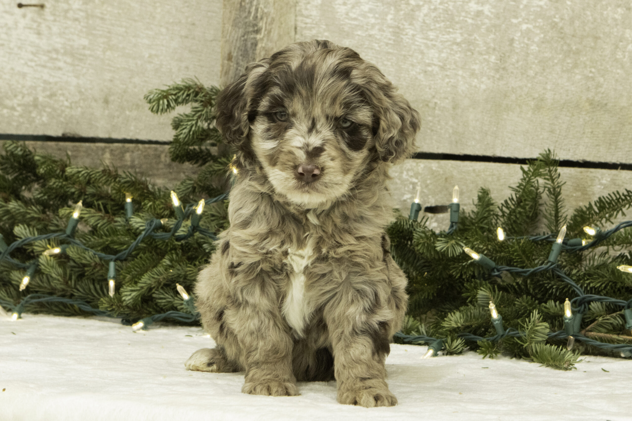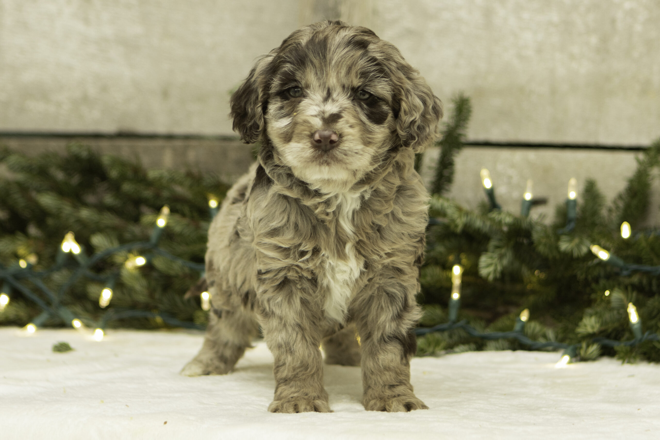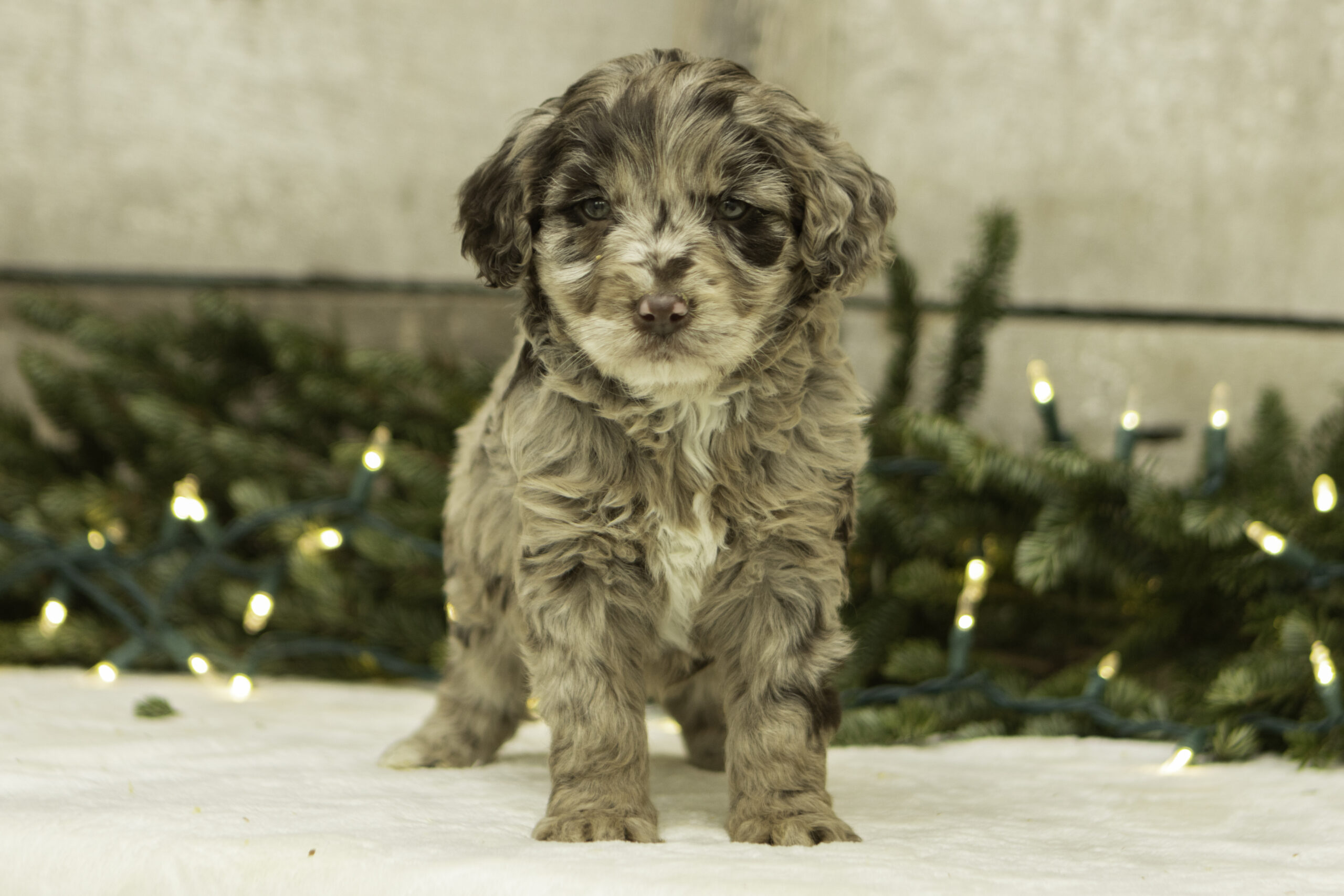 Finn is a 41lb Poodle with a gentle, thoughtful spirit. While he may come off as a bit reserved at first, his quiet curiosity quickly shines through. Once he’s comfortable, Finn reveals his sweet and loving nature. He’s a calm and steady companion who brings a balanced temperament to our program. With his refined build and kind personality, Finn is a wonderful sire who consistently passes down his soft nature and intelligence to his puppies.