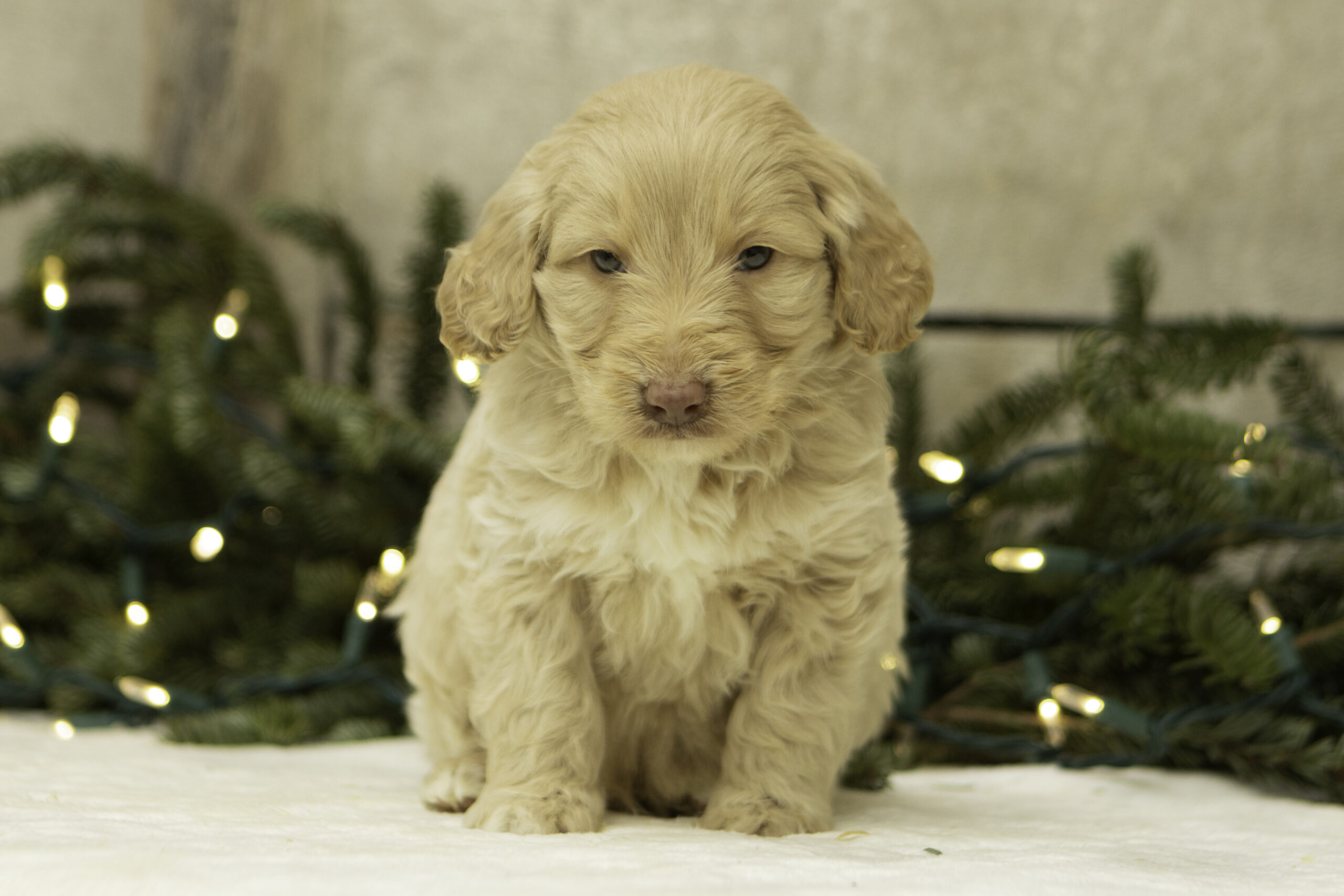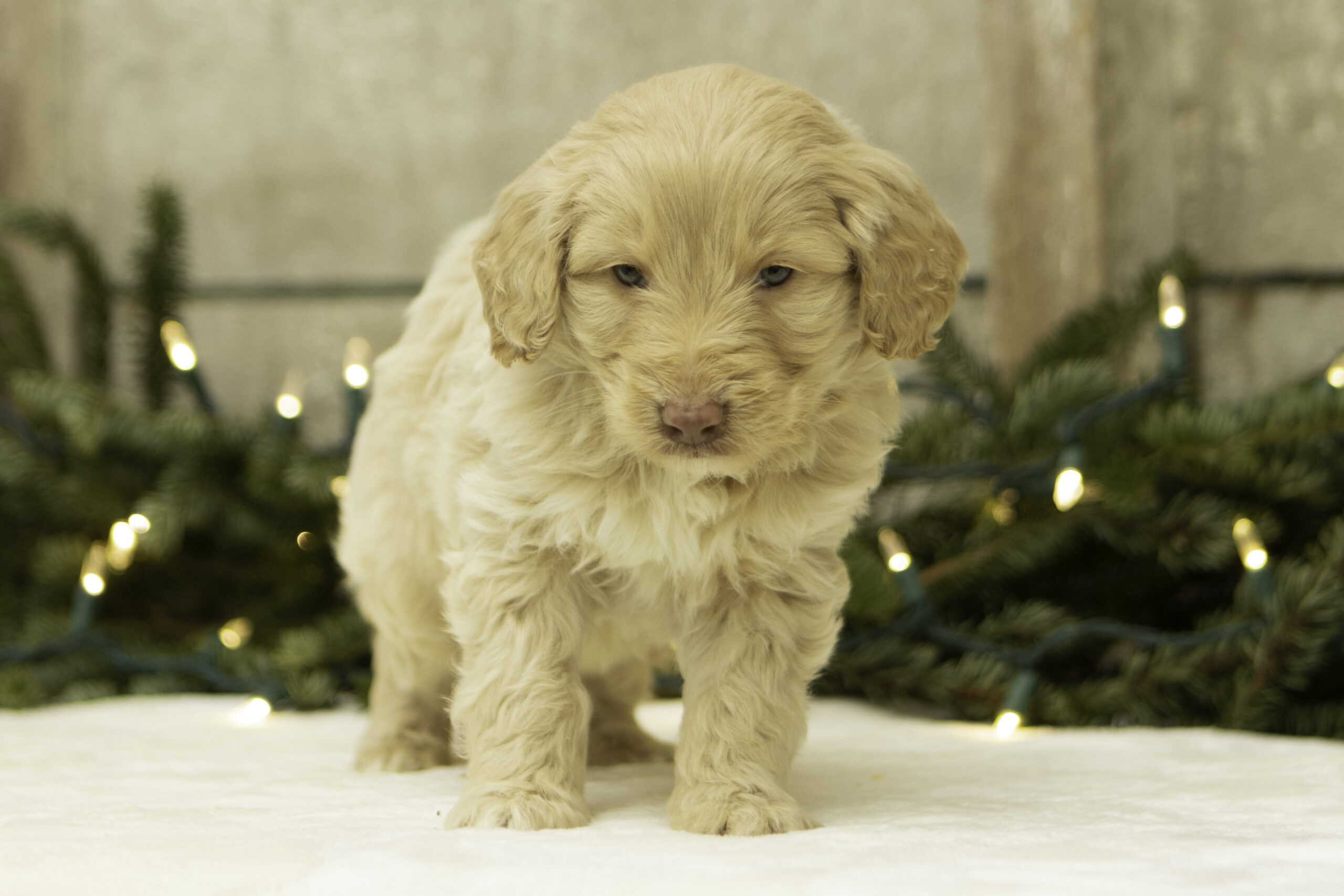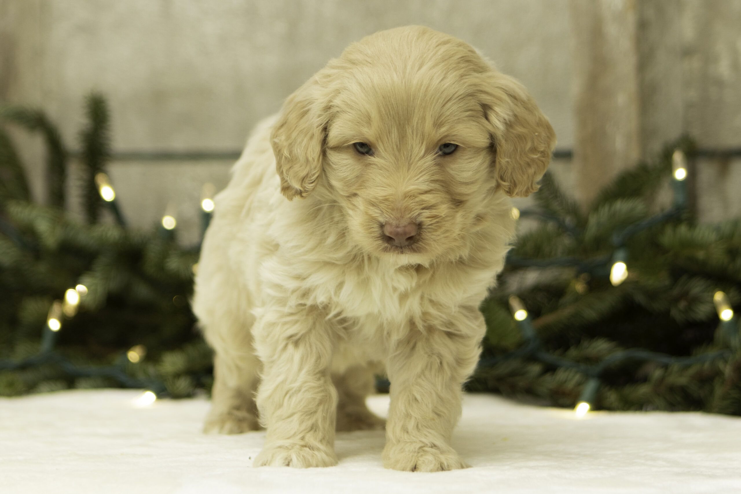 Finn is a 41lb Poodle with a gentle, thoughtful spirit. While he may come off as a bit reserved at first, his quiet curiosity quickly shines through. Once he’s comfortable, Finn reveals his sweet and loving nature. He’s a calm and steady companion who brings a balanced temperament to our program. With his refined build and kind personality, Finn is a wonderful sire who consistently passes down his soft nature and intelligence to his puppies.