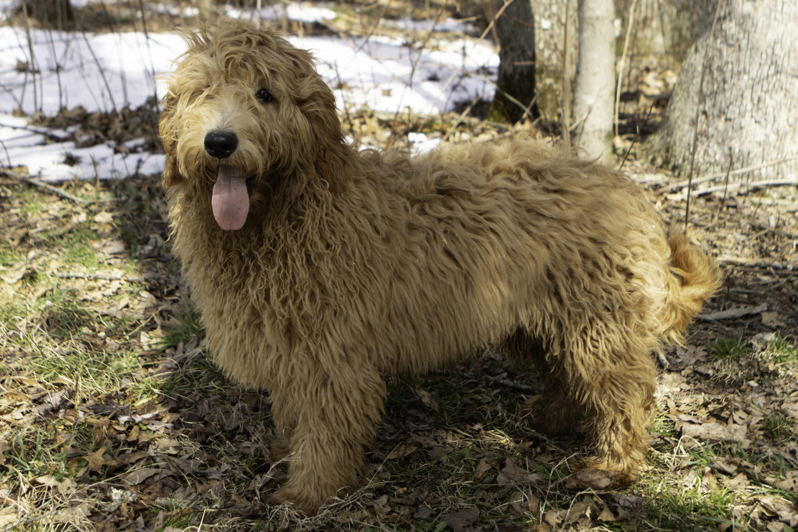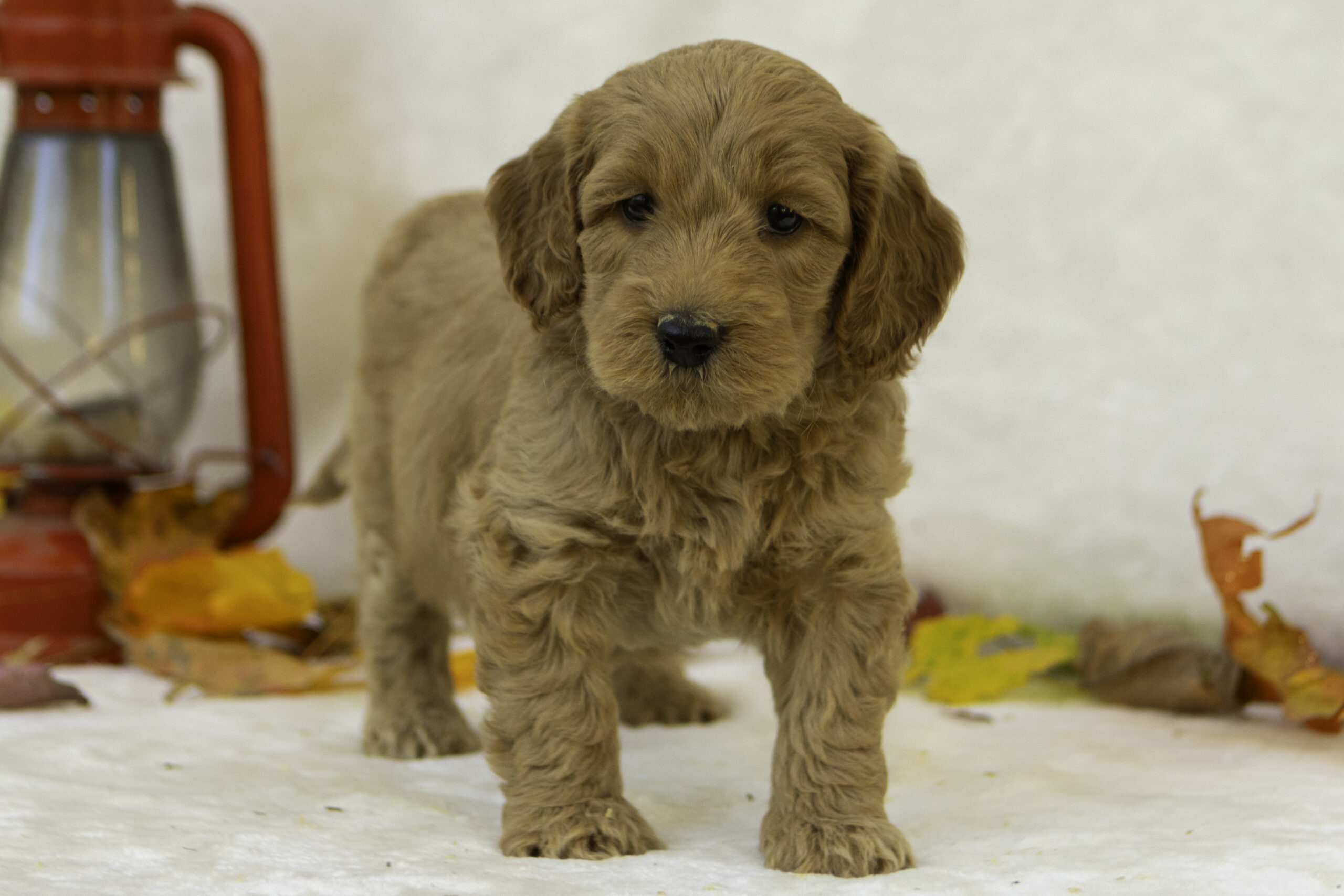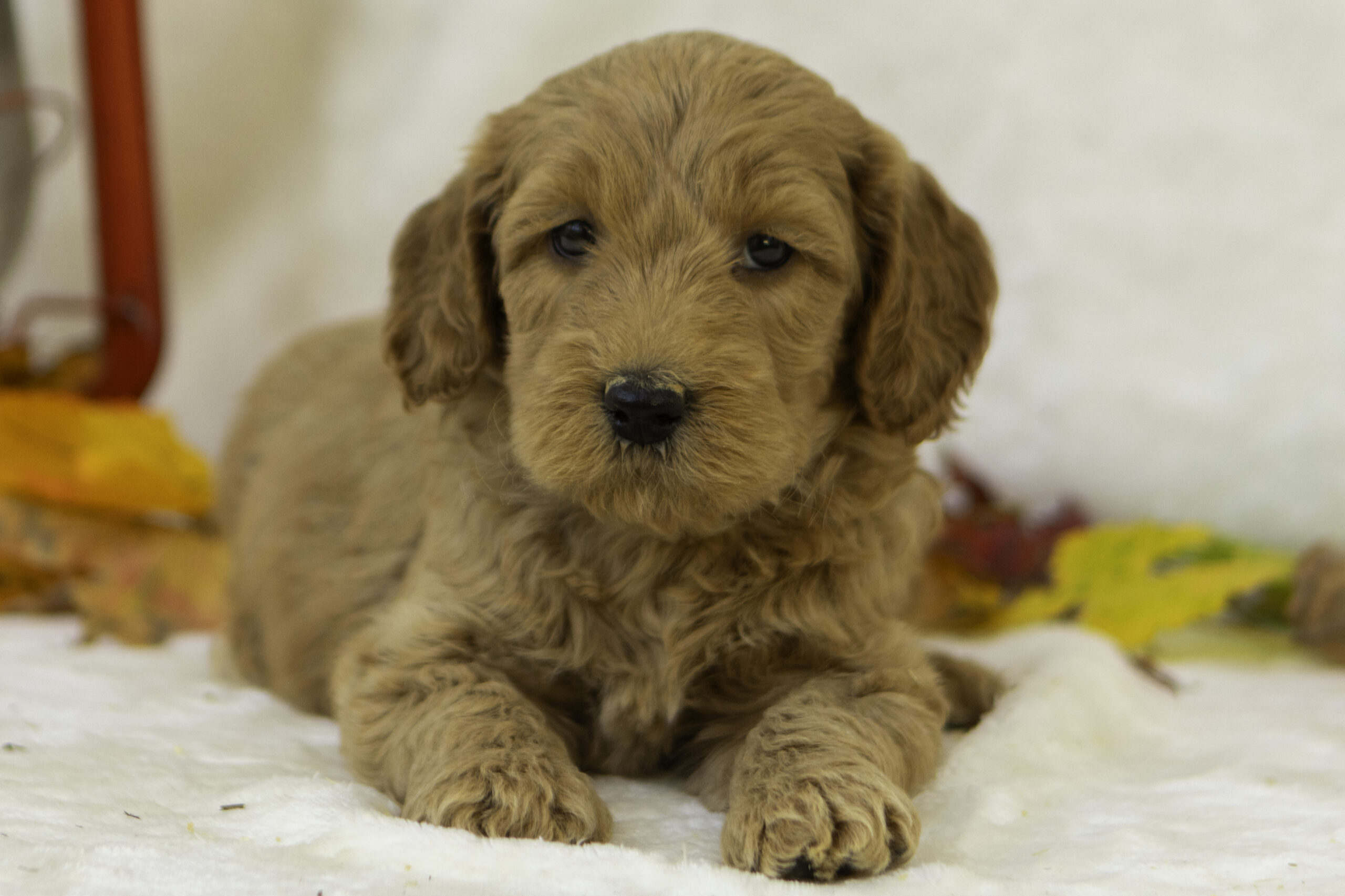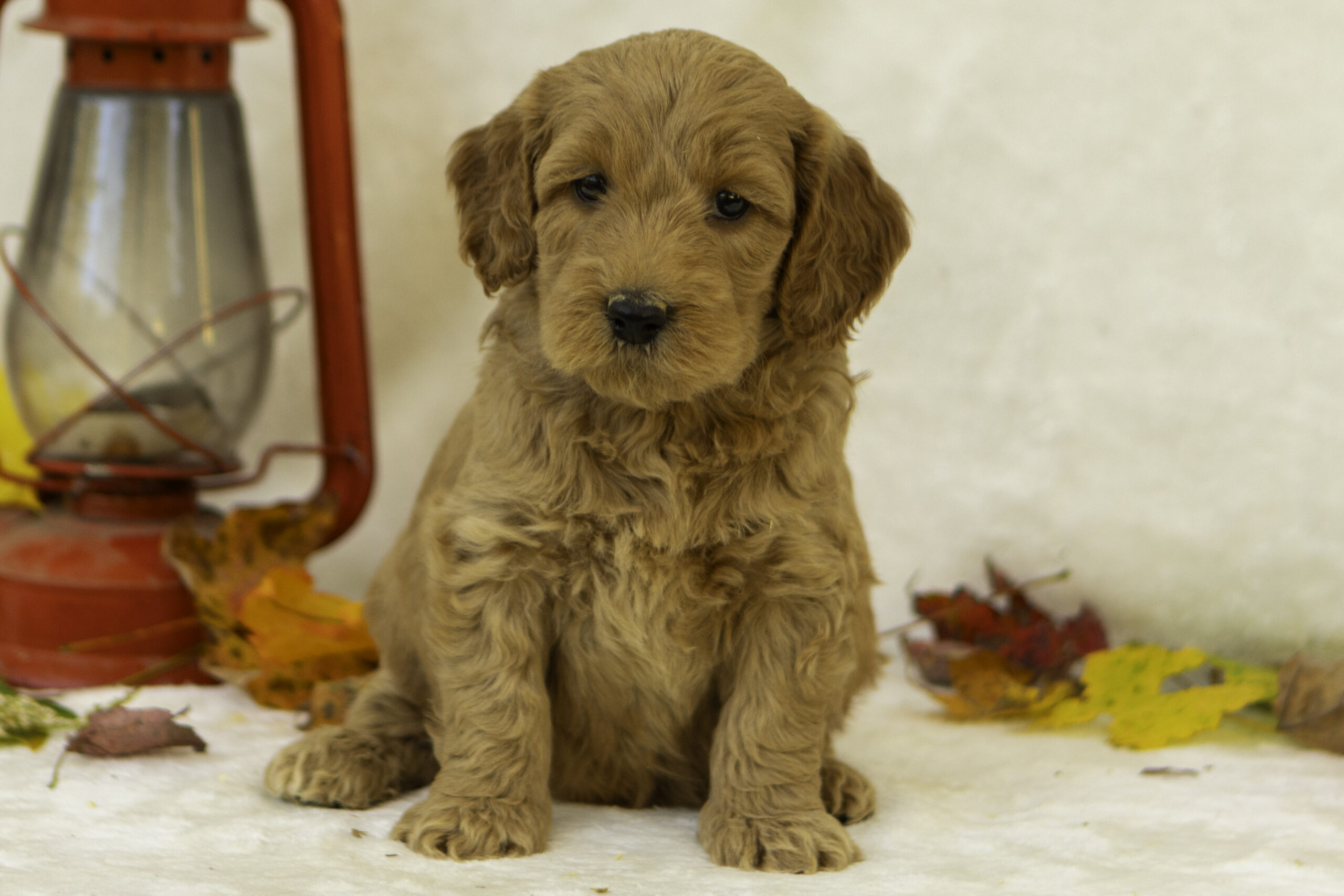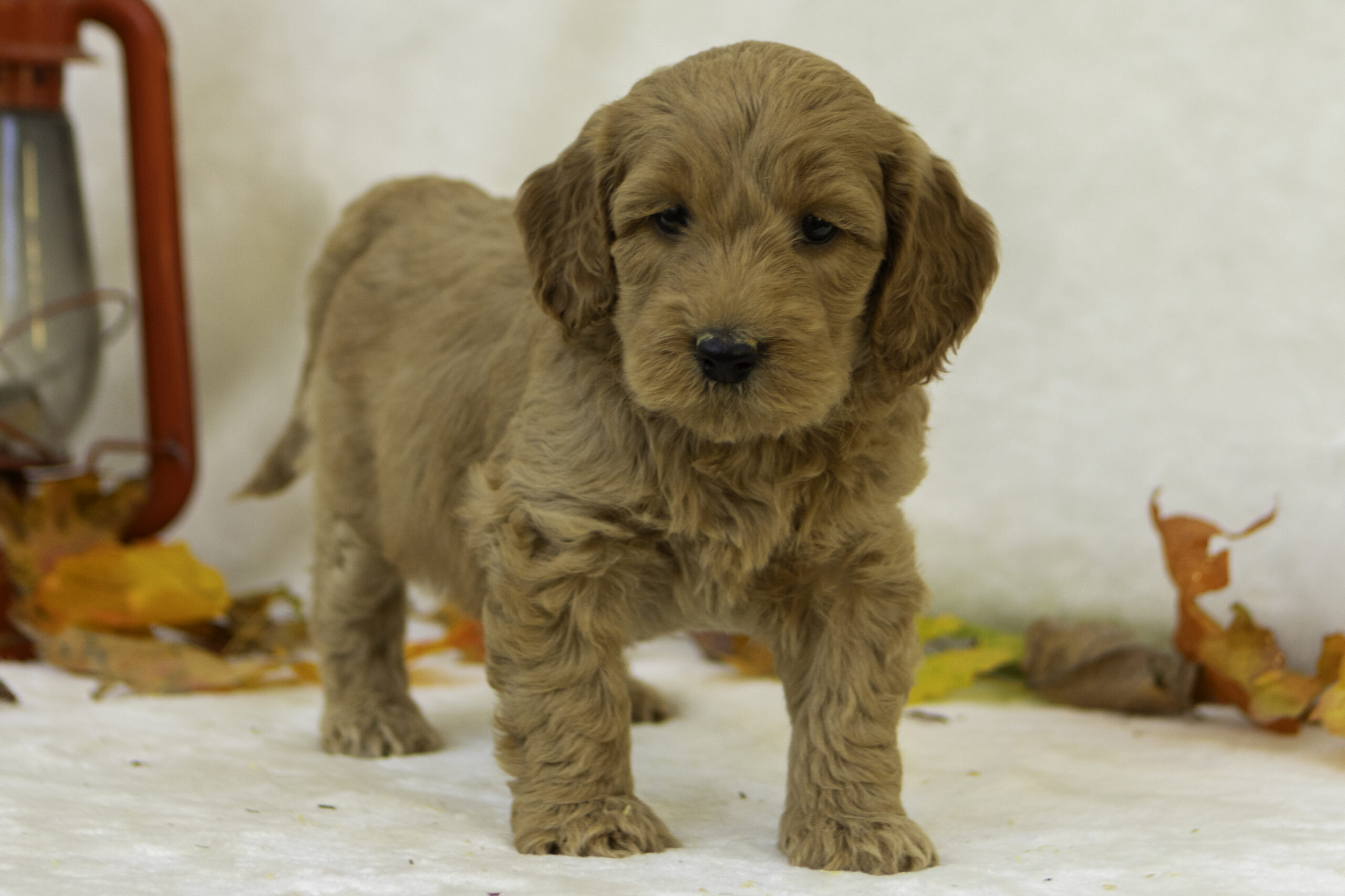 Elsa is a 45-pound apricot F1 Goldendoodle and one of our wonderful moms. She has an incredibly friendly nature and loves to greet people with a gentle lick to the hand. True to her “velcro” personality, Elsa sticks close by and is always eager to be part of what’s going on. Her affectionate, loyal temperament shines through in her puppies, who tend to inherit her loving, people-oriented personality and eagerness to bond with their families.