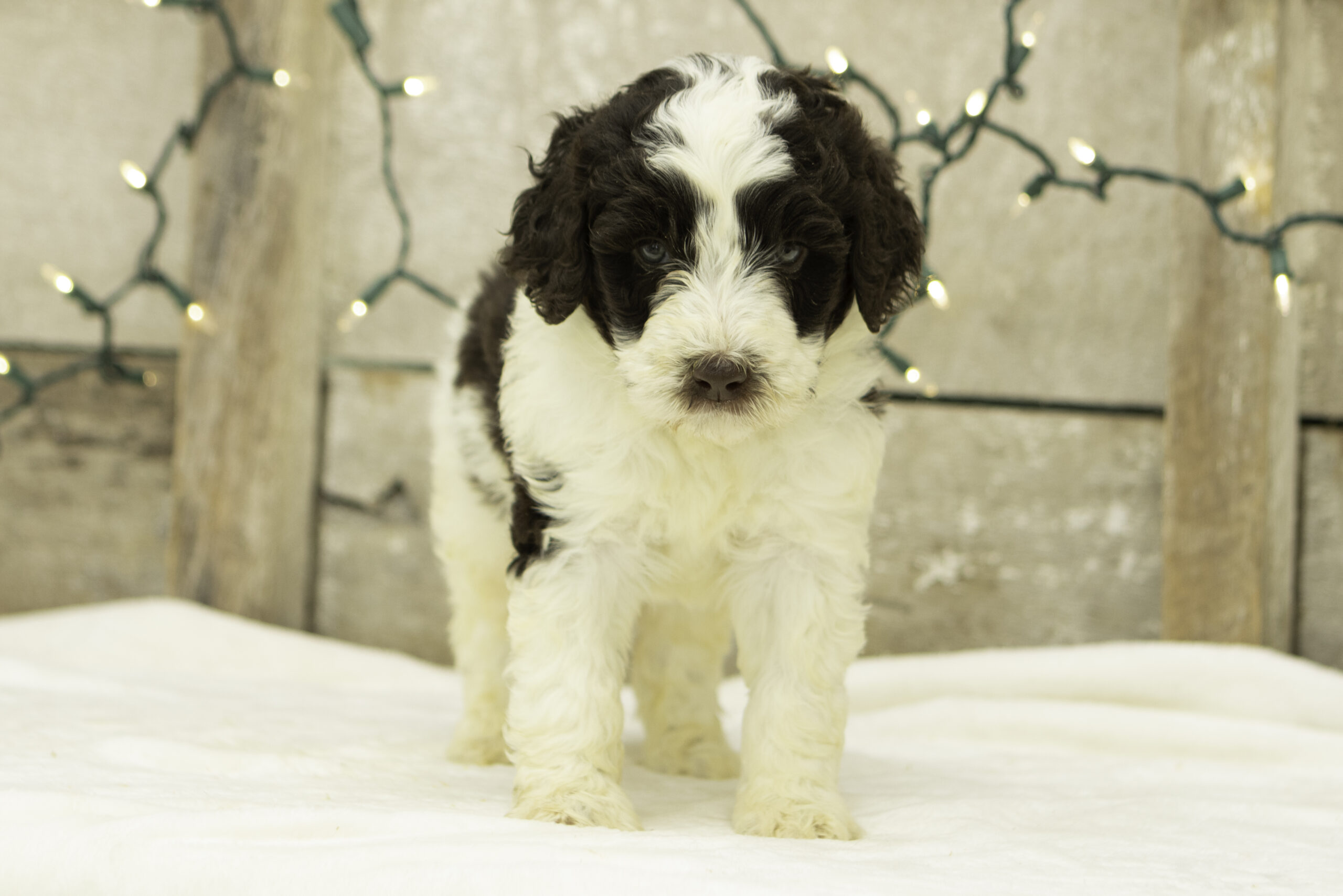 Affy is an AKC chocolate parti standard poodle sire. He weighs in at 61 lbs and has a very calm, low-energy temperament. He carries himself well, trains easily, and is a bit timid at first, but once comfortable he shows a true gentle, friendly nature.
