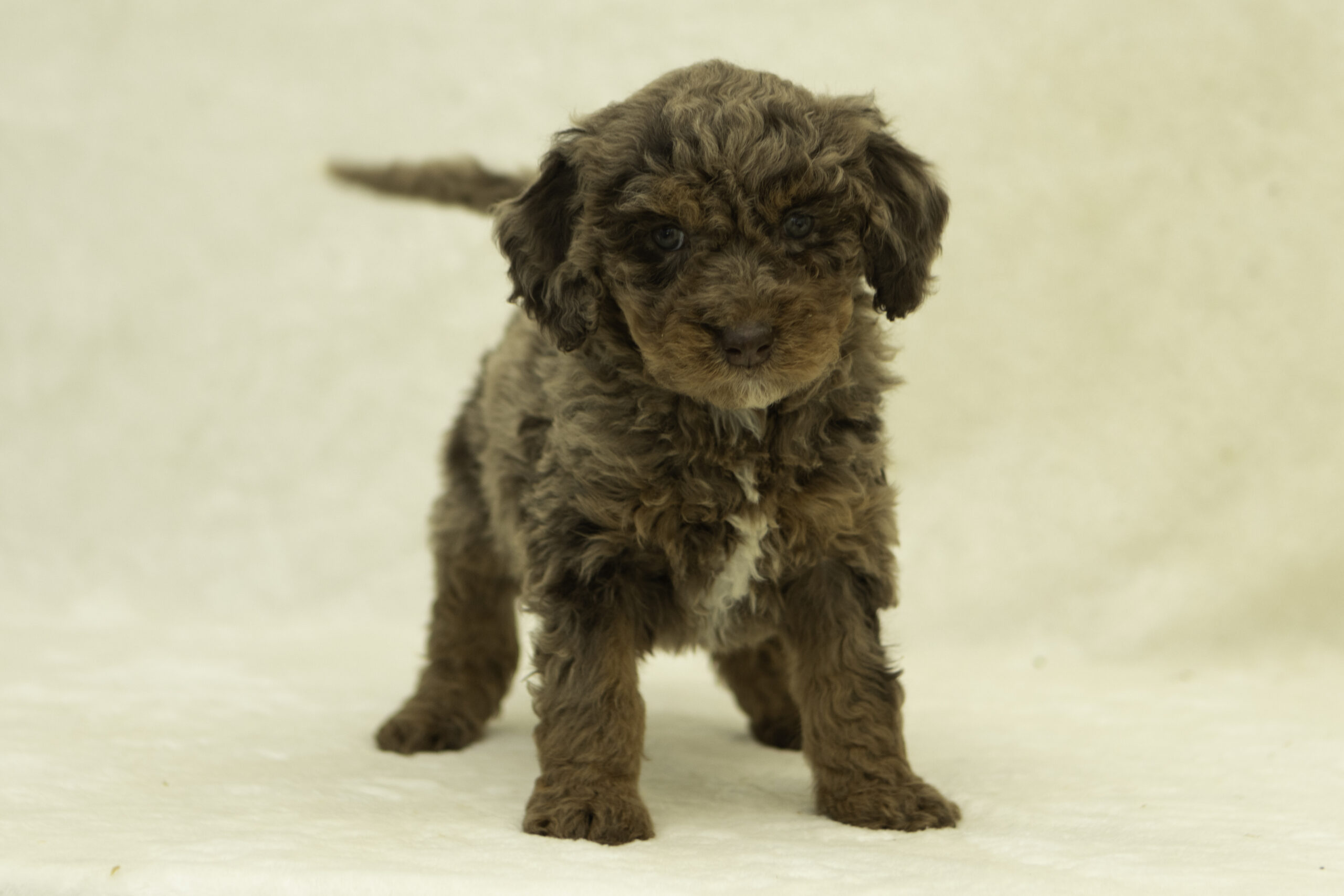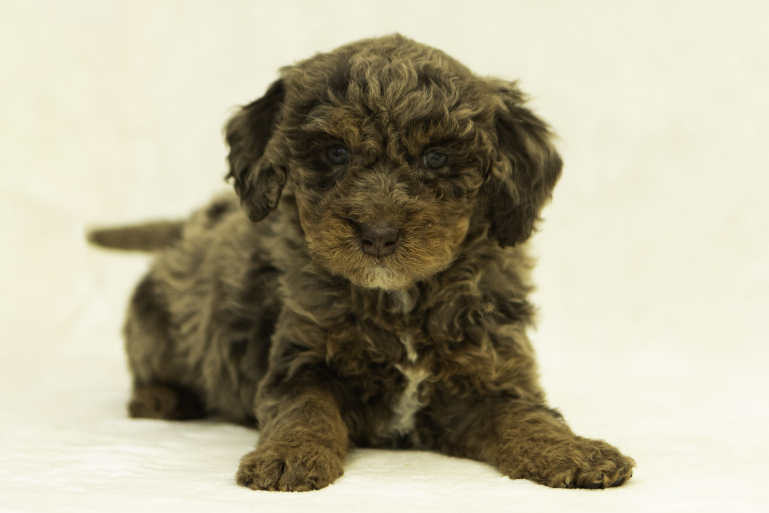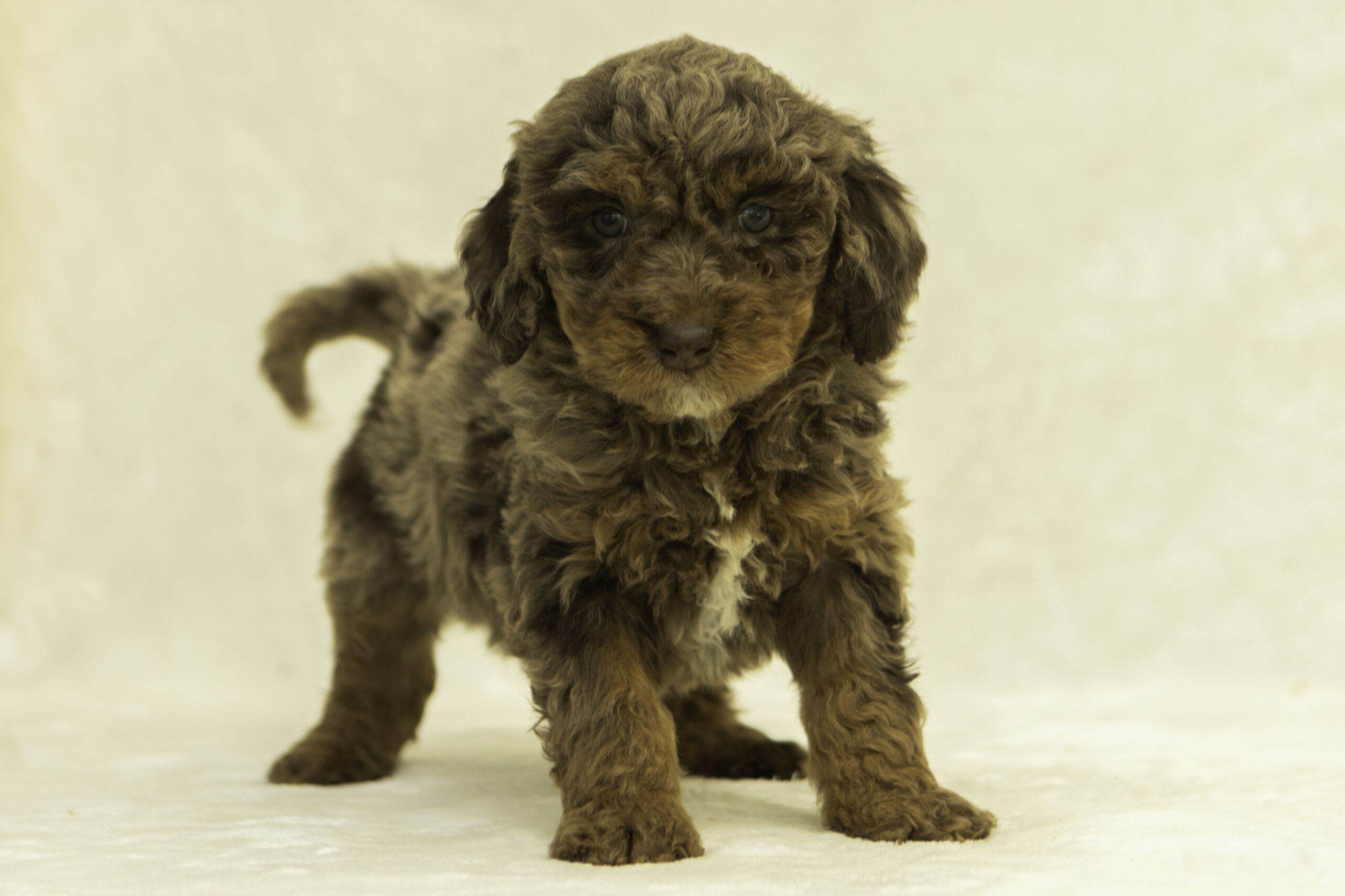 Finn is a 41lb Poodle with a gentle, thoughtful spirit. While he may come off as a bit reserved at first, his quiet curiosity quickly shines through. Once he’s comfortable, Finn reveals his sweet and loving nature. He’s a calm and steady companion who brings a balanced temperament to our program. With his refined build and kind personality, Finn is a wonderful sire who consistently passes down his soft nature and intelligence to his puppies.