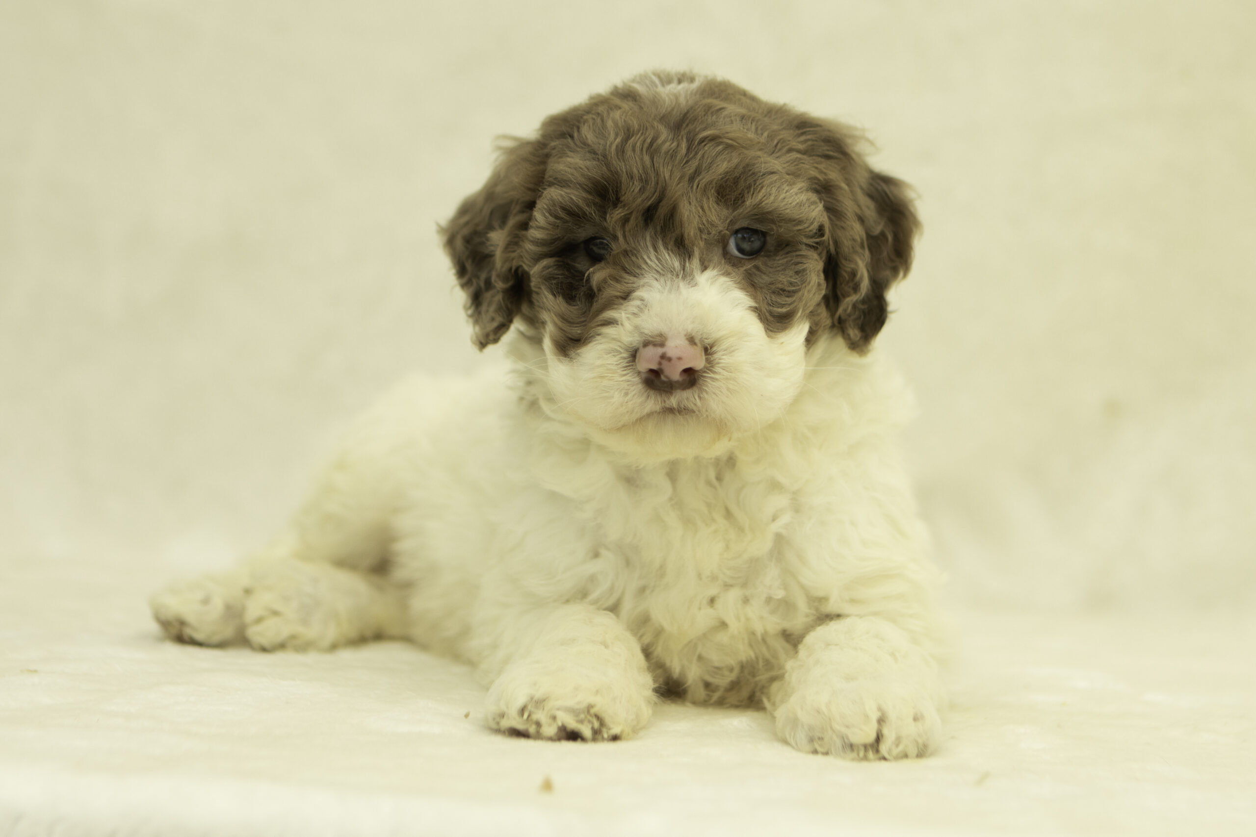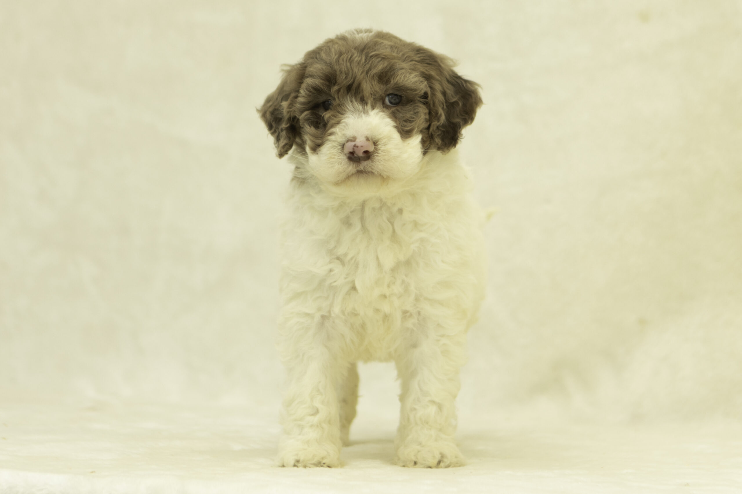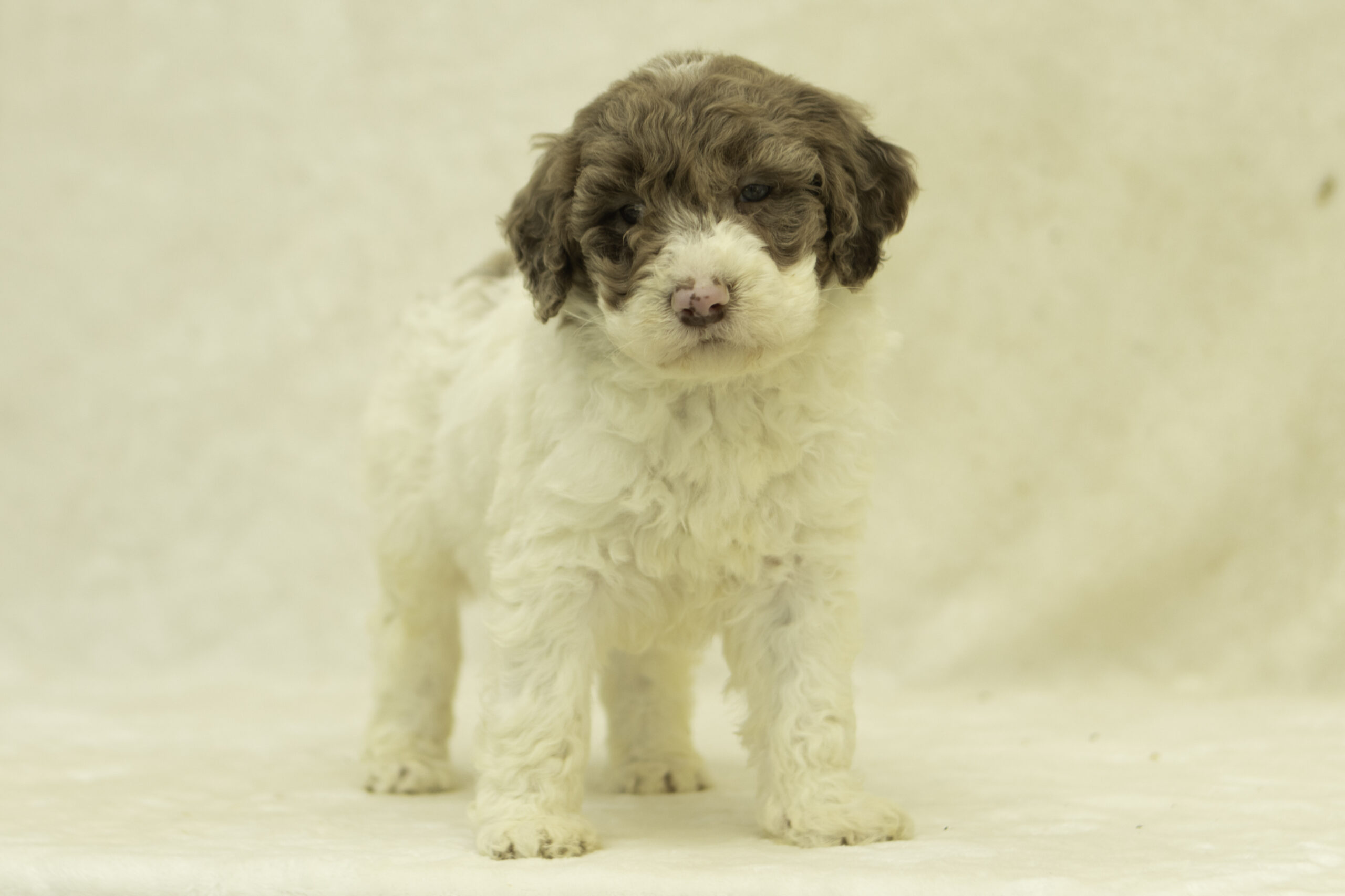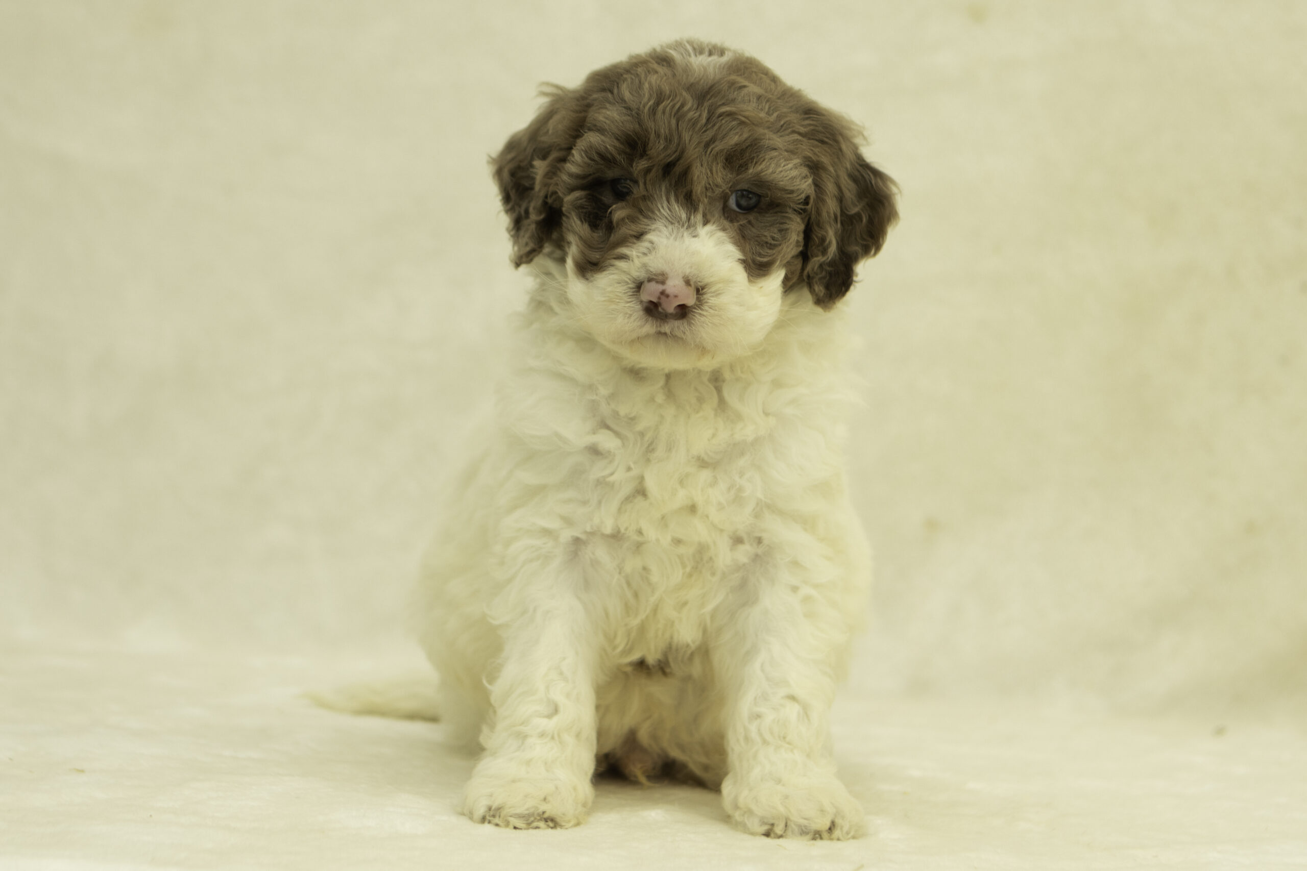 Finn is a 41lb Poodle with a gentle, thoughtful spirit. While he may come off as a bit reserved at first, his quiet curiosity quickly shines through. Once he’s comfortable, Finn reveals his sweet and loving nature. He’s a calm and steady companion who brings a balanced temperament to our program. With his refined build and kind personality, Finn is a wonderful sire who consistently passes down his soft nature and intelligence to his puppies.