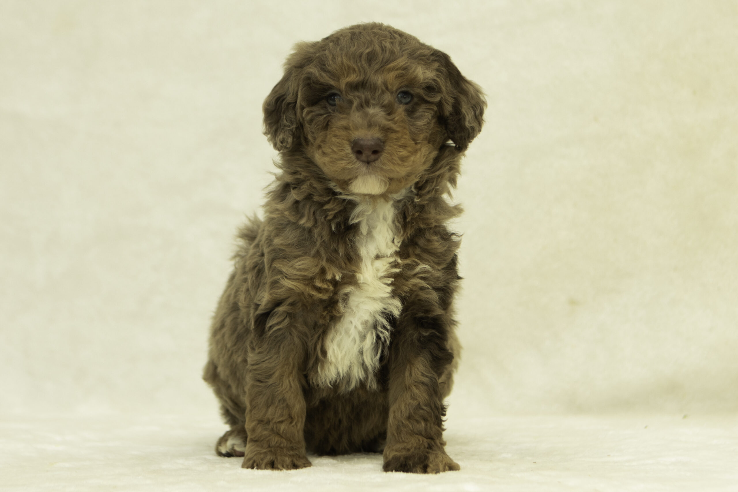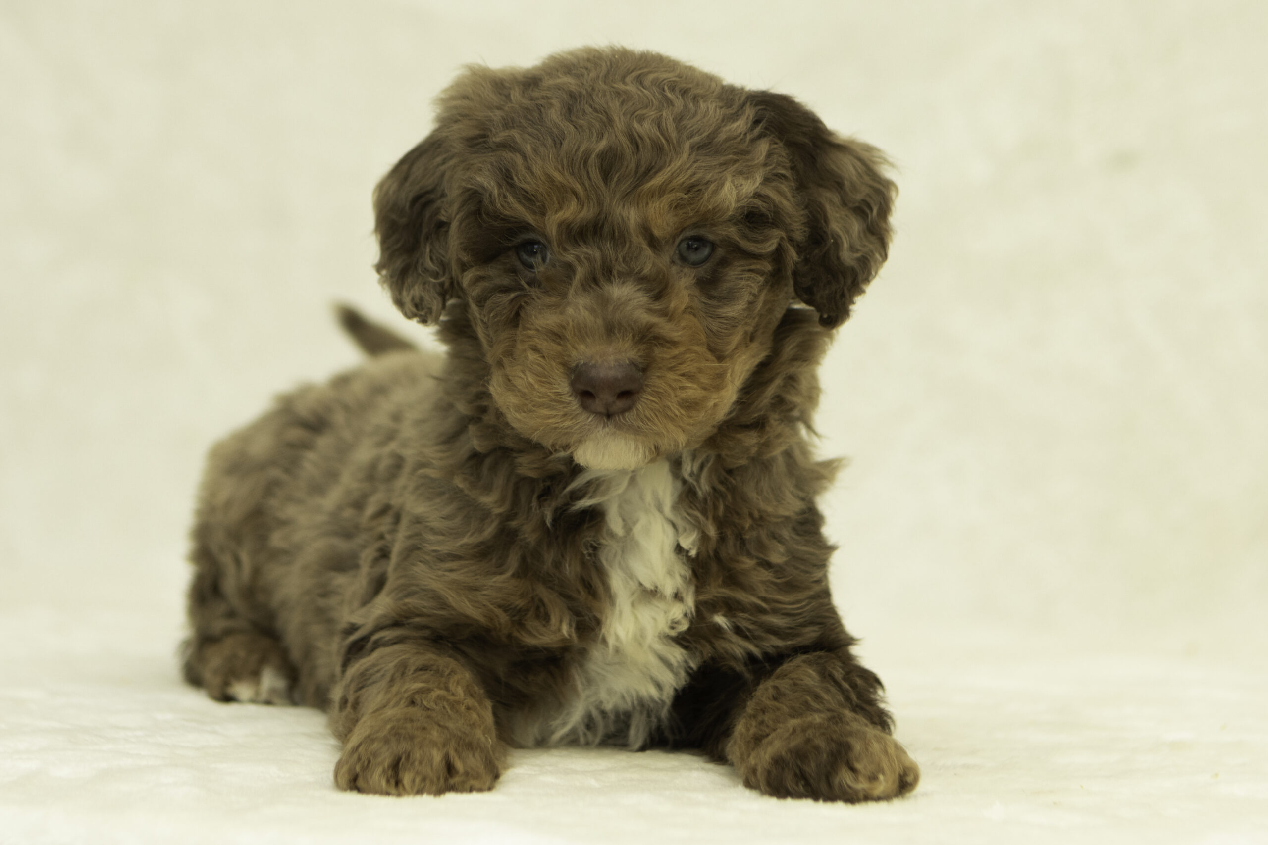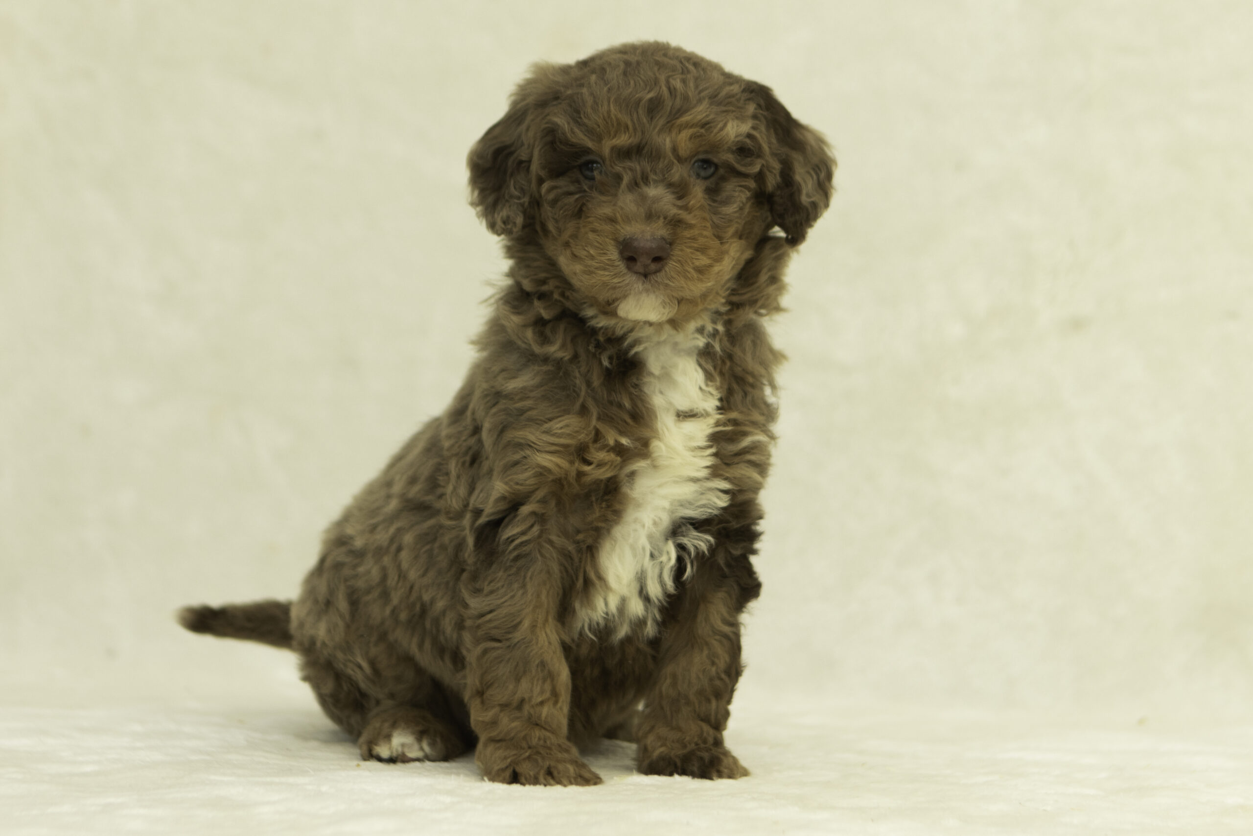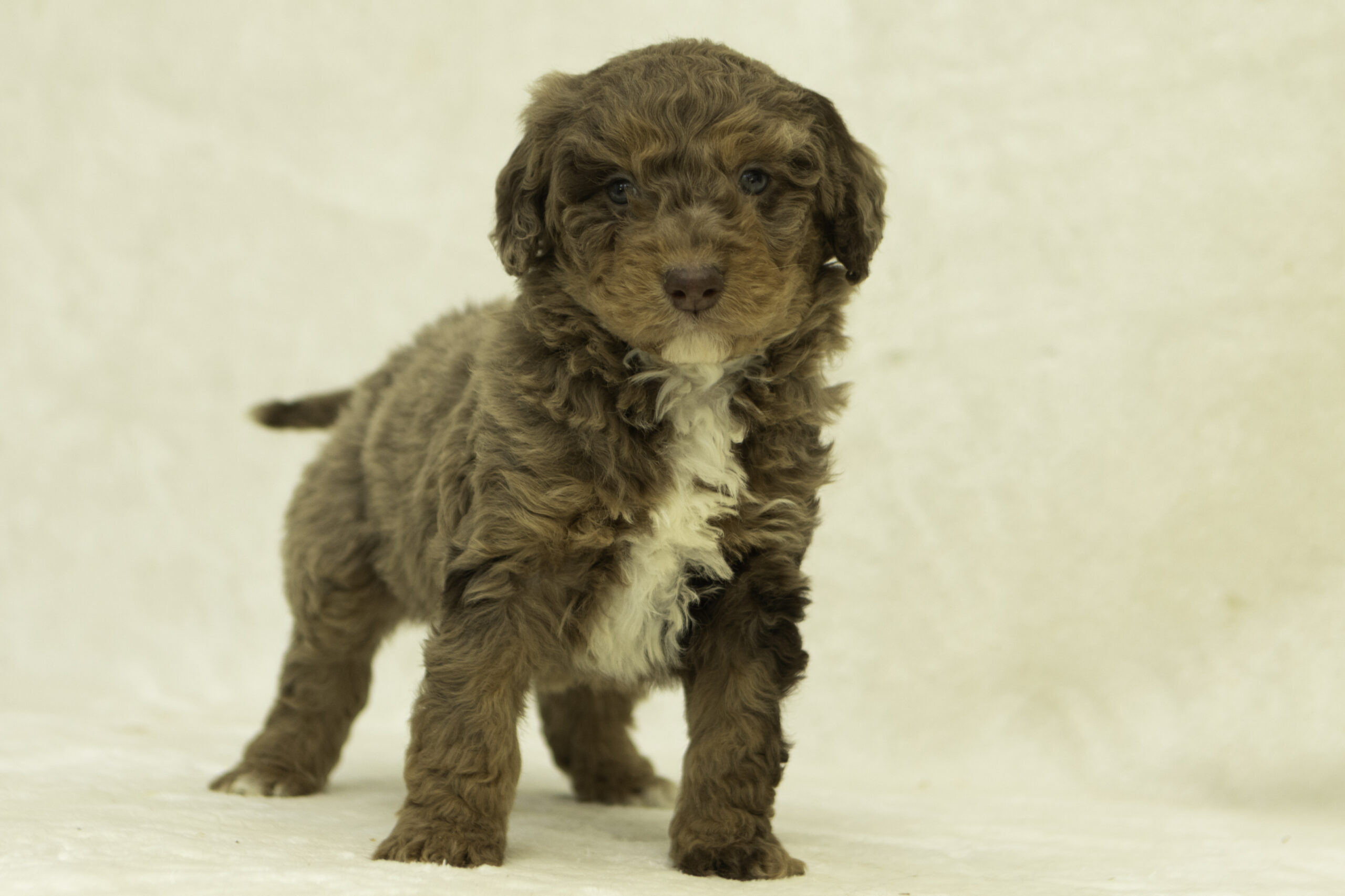 Finn is a 41lb Poodle with a gentle, thoughtful spirit. While he may come off as a bit reserved at first, his quiet curiosity quickly shines through. Once he’s comfortable, Finn reveals his sweet and loving nature. He’s a calm and steady companion who brings a balanced temperament to our program. With his refined build and kind personality, Finn is a wonderful sire who consistently passes down his soft nature and intelligence to his puppies.