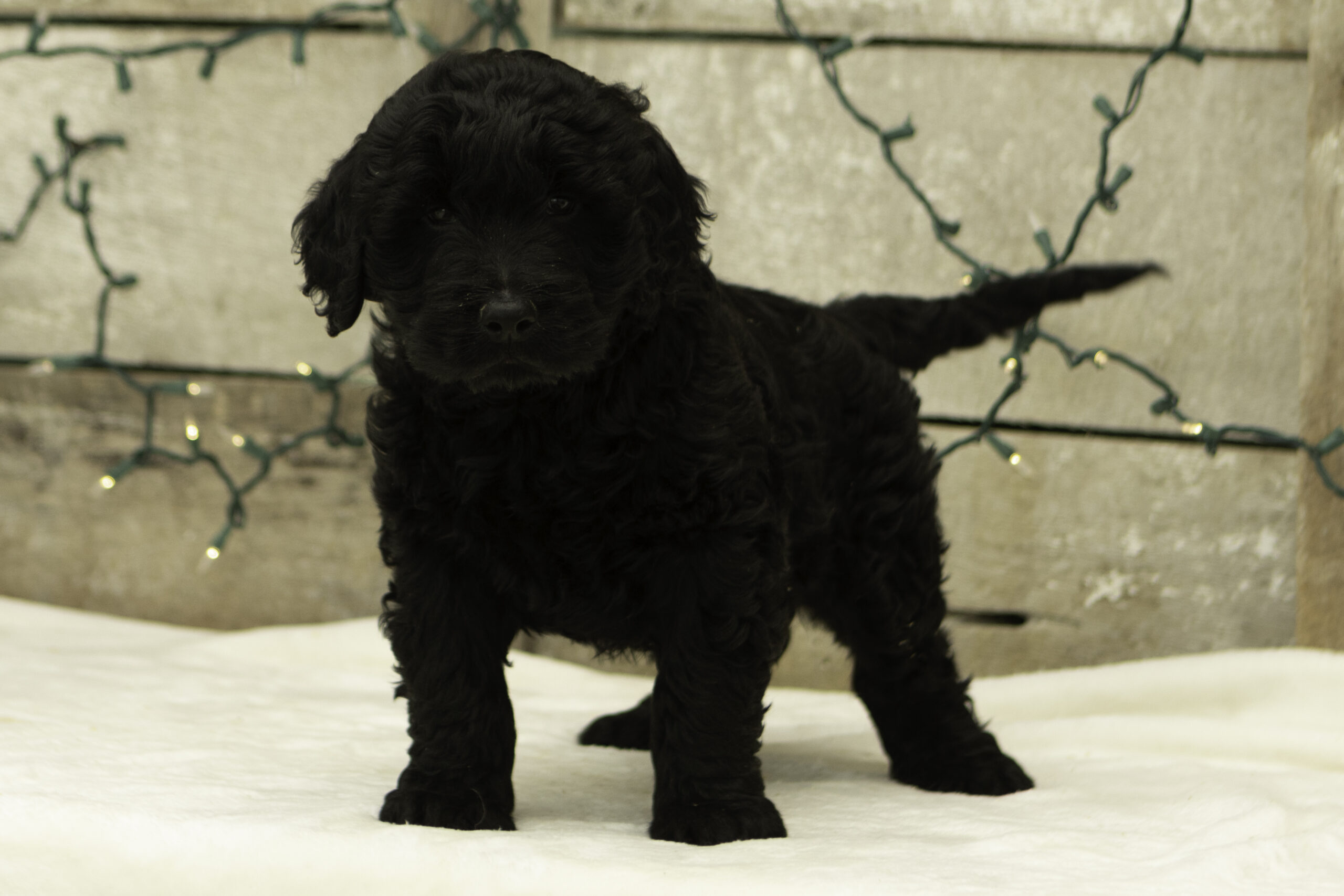Affy is an AKC chocolate parti standard poodle sire. He weighs in at 61 lbs and has a very calm, low-energy temperament. He carries himself well, trains easily, and is a bit timid at first, but once comfortable he shows a true gentle, friendly nature.