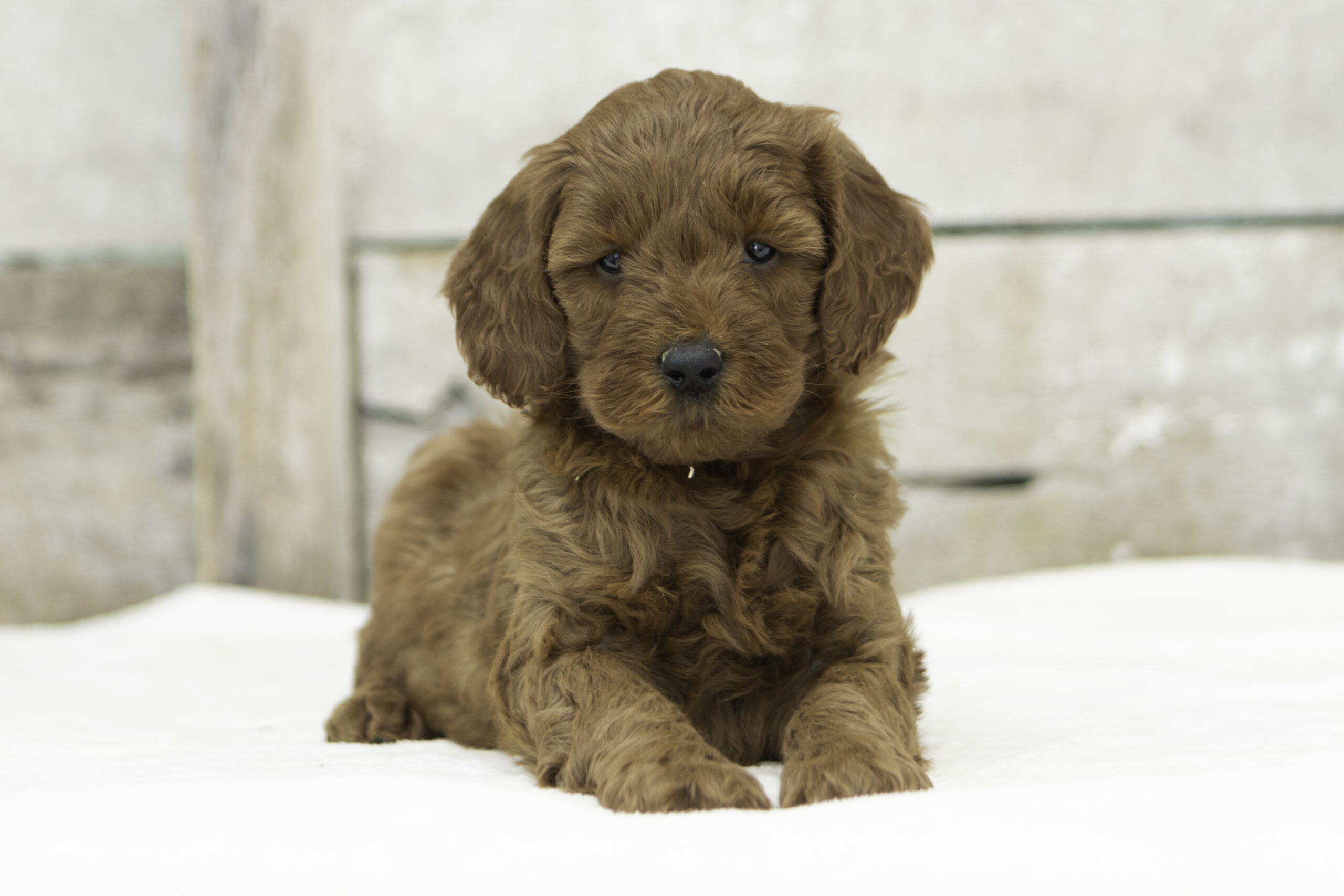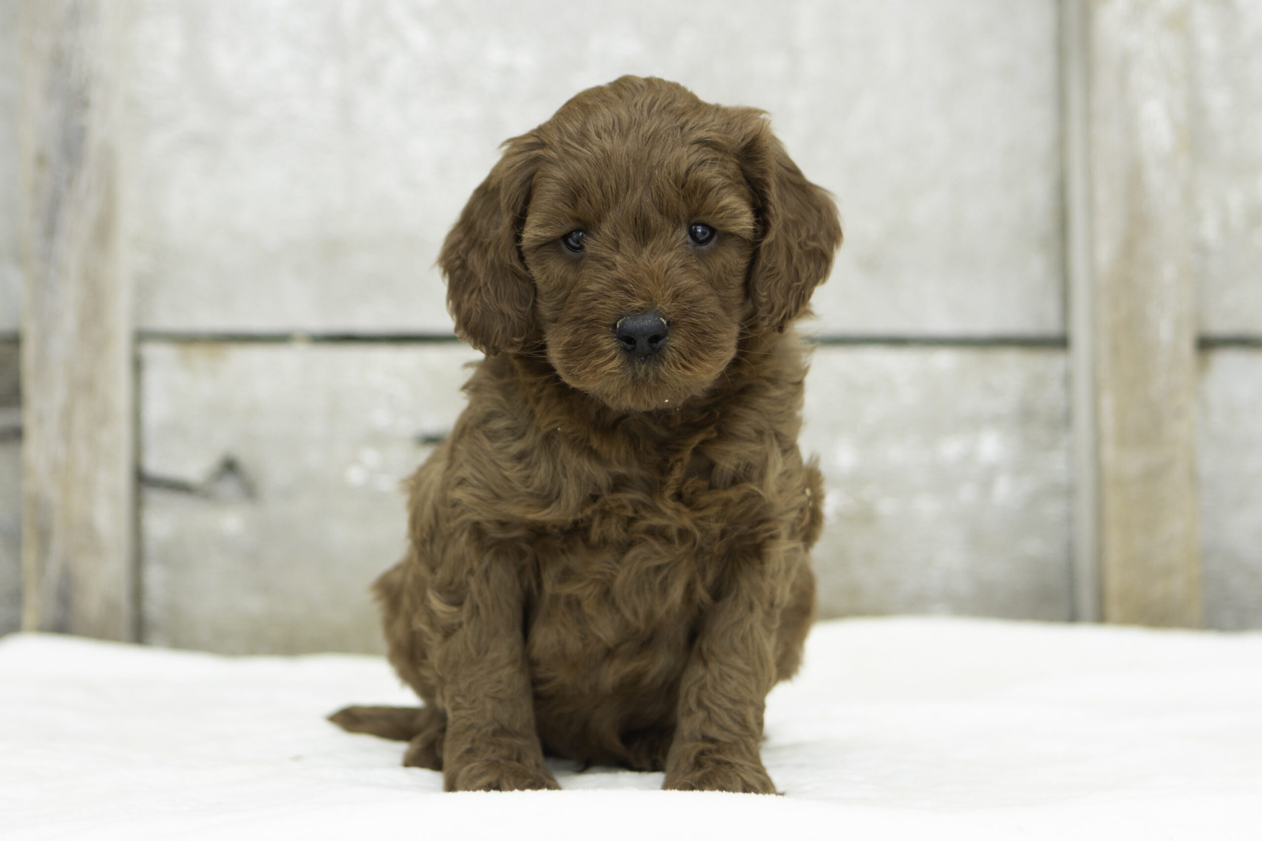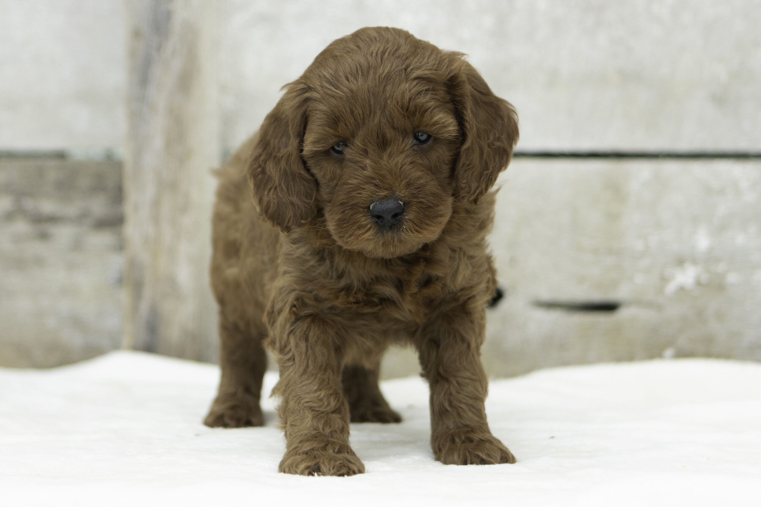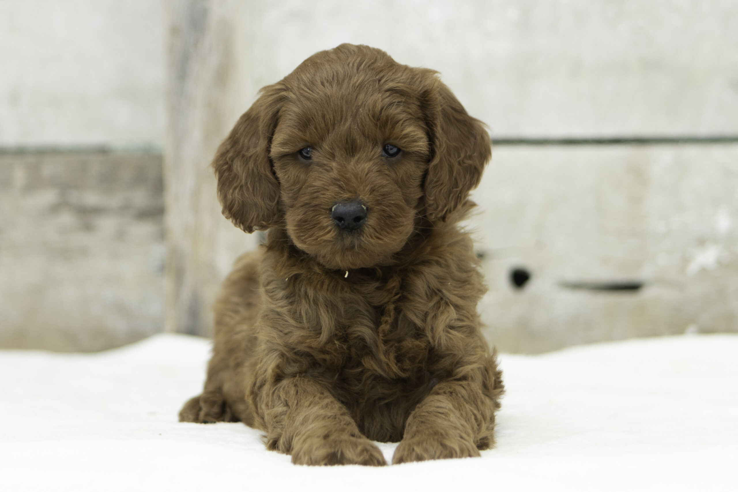Lou is a calm and happy doodle mom weighing 51 pounds. Friendly without being overbearing, she loves to quietly hang around and offer gentle companionship. Her patient and easygoing nature shines through in the way she cares for her puppies, helping them grow into well-balanced, loving companions.