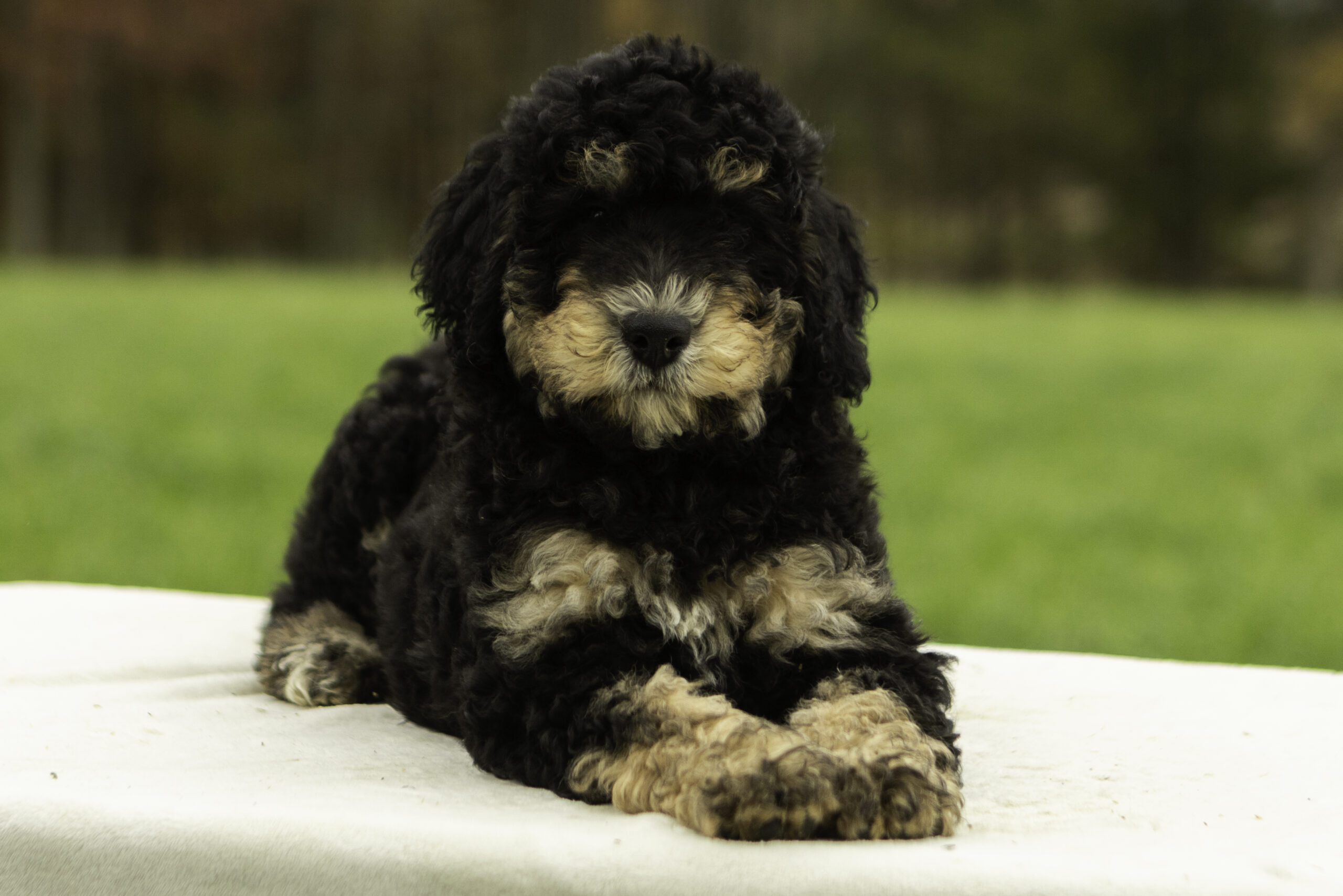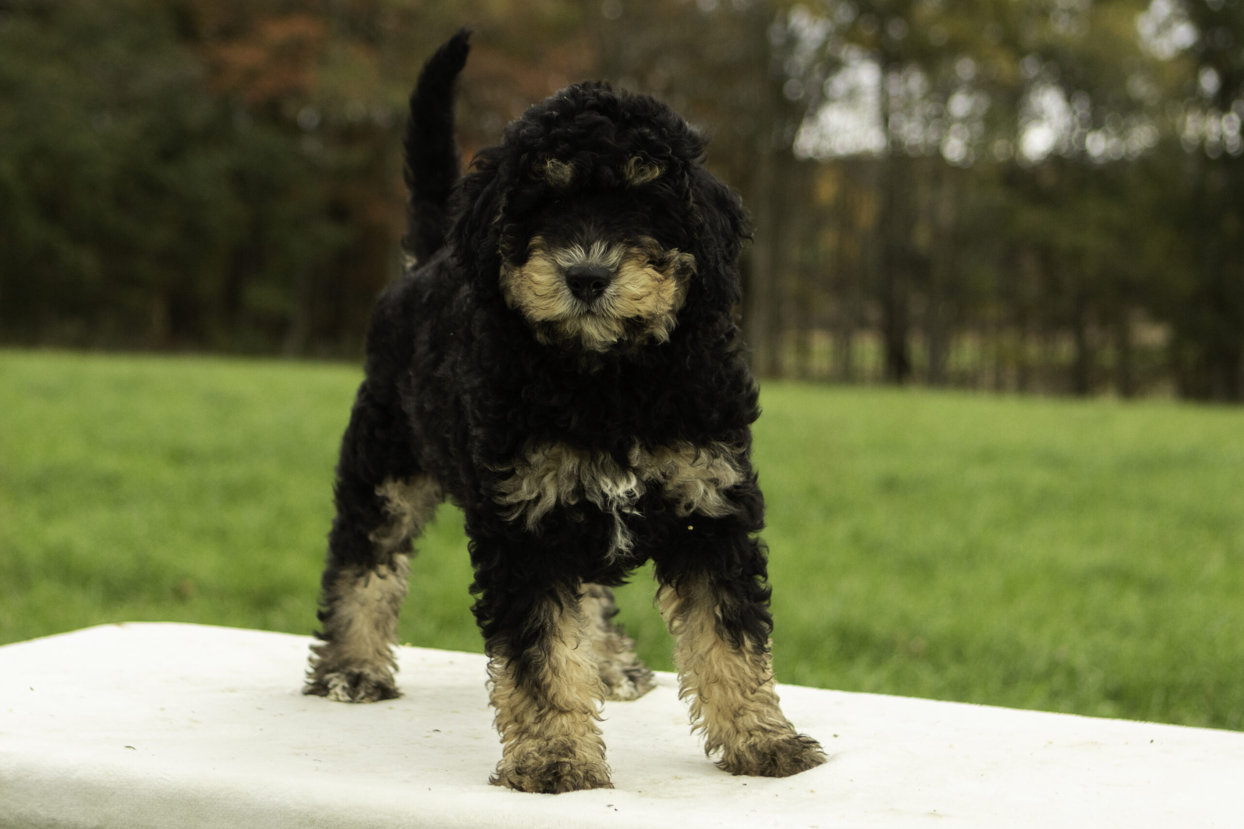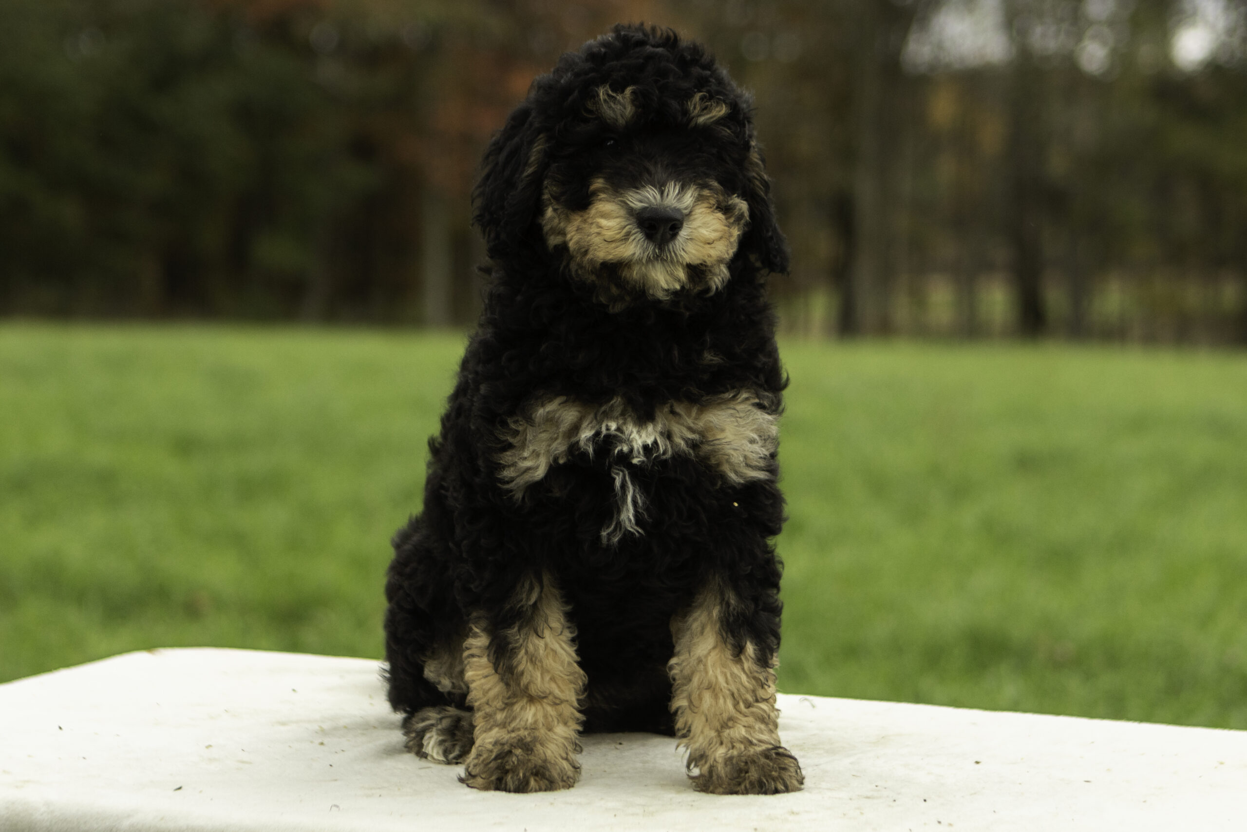 Jasper is a handsome 43-pound tri-color Bernedoodle and one of our outstanding sires. Friendly and energetic, he loves to play and brings that same joyful spirit to his puppies. Jasper’s pups are known for having the best personalities—they’ll run and play with endless energy, but the moment you scoop them up, they melt into your arms and love to cuddle. With his affectionate nature and fun-loving temperament, Jasper passes on the perfect balance of playfulness and snuggly sweetness. All of our parent dogs have been Embark/DNA tested.