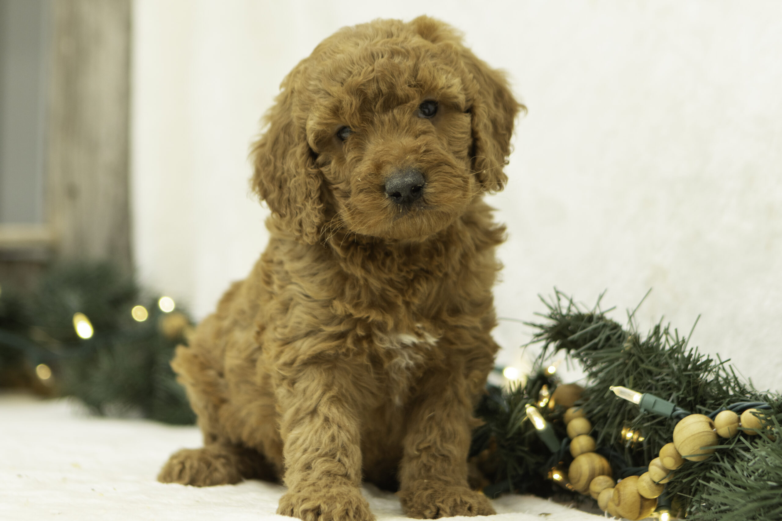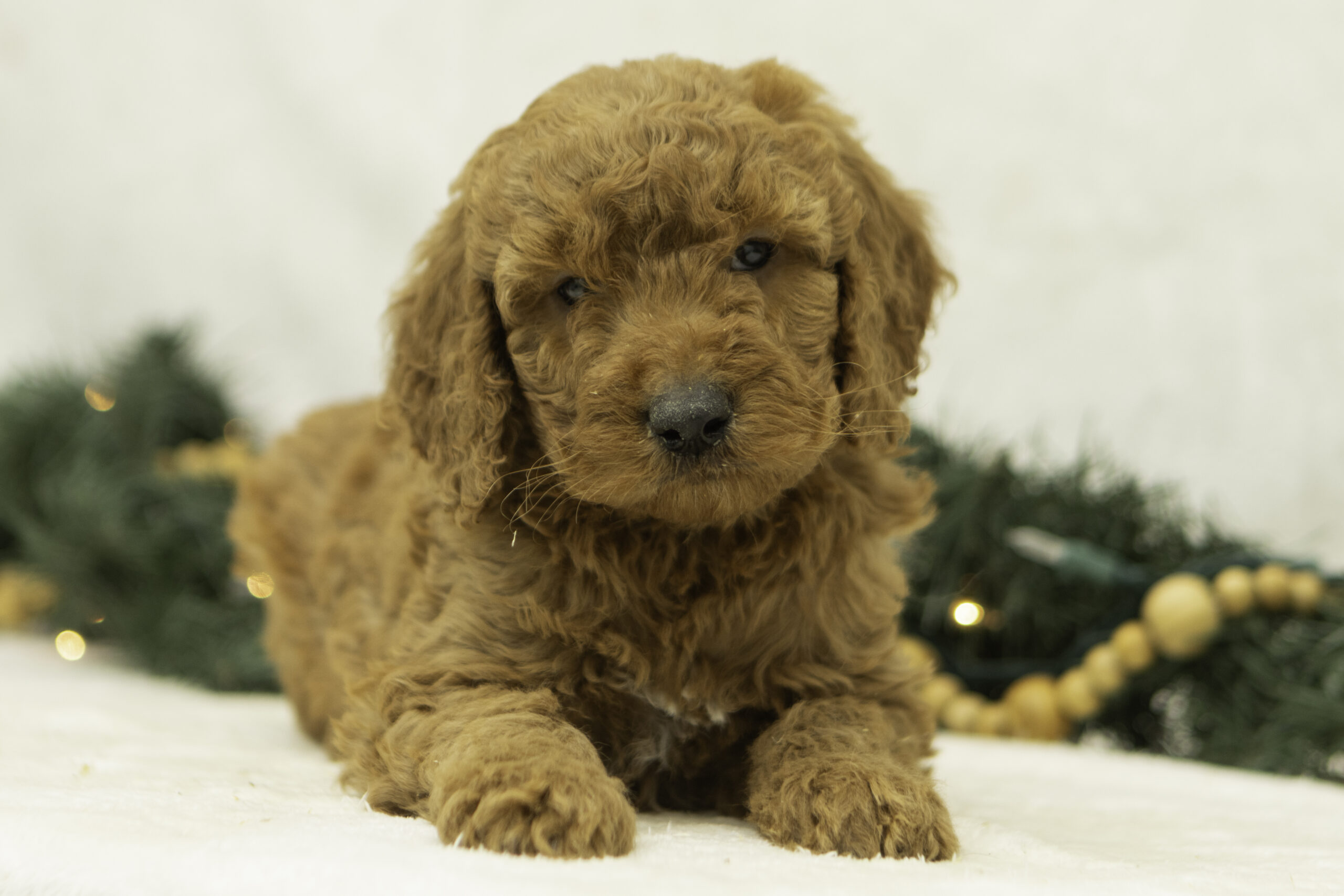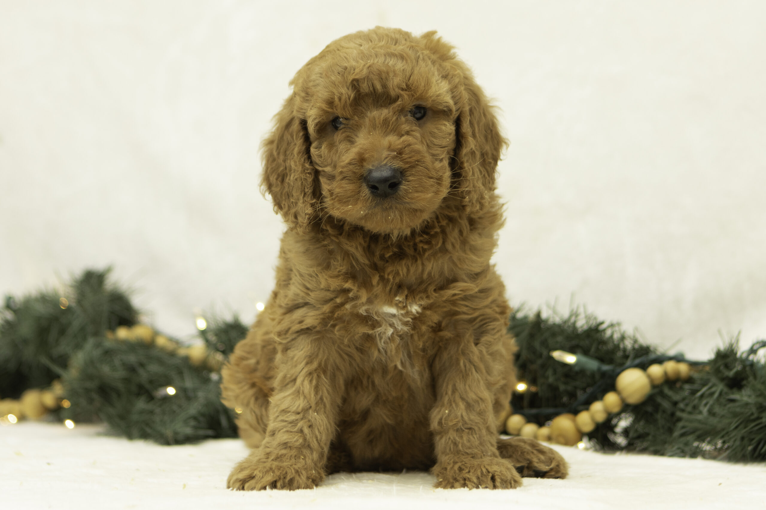 Sage is a 54-pound F1 Goldendoodle with a brilliant mind and a loving, patient nature. Outgoing and curious, she loves to explore her surroundings and make new friends. Her intelligence and gentle temperament make her a wonderful companion for families seeking a smart, affectionate, and adventurous dog.