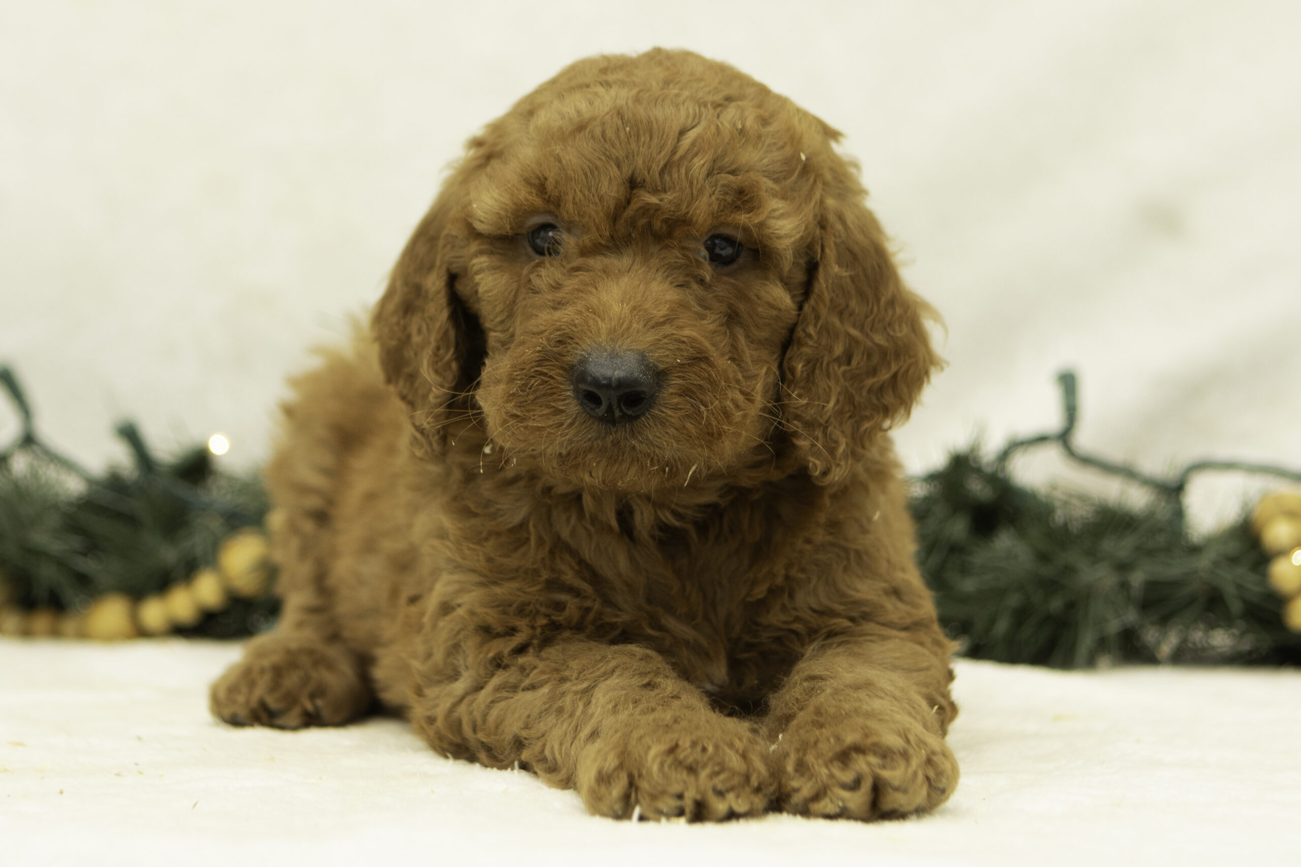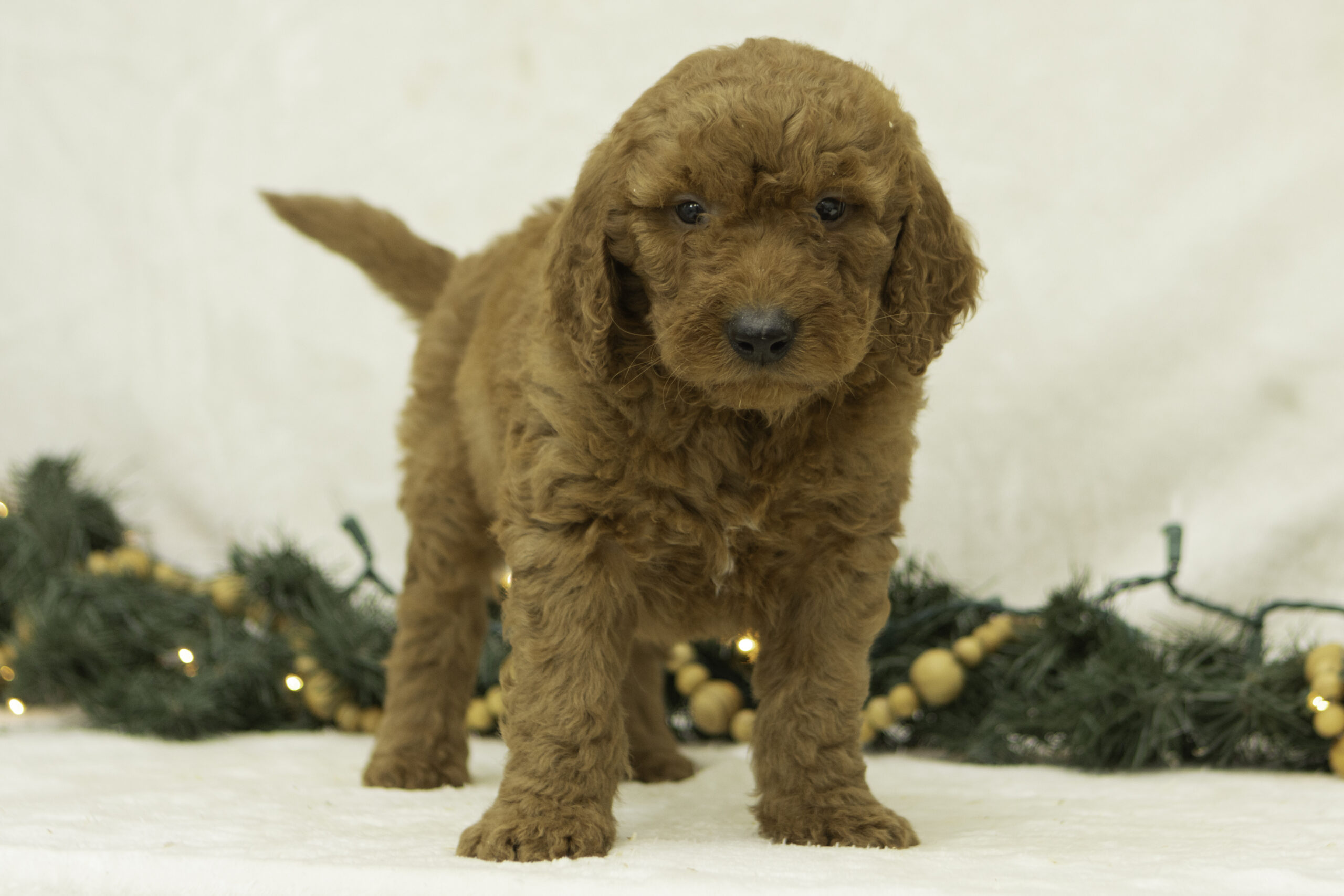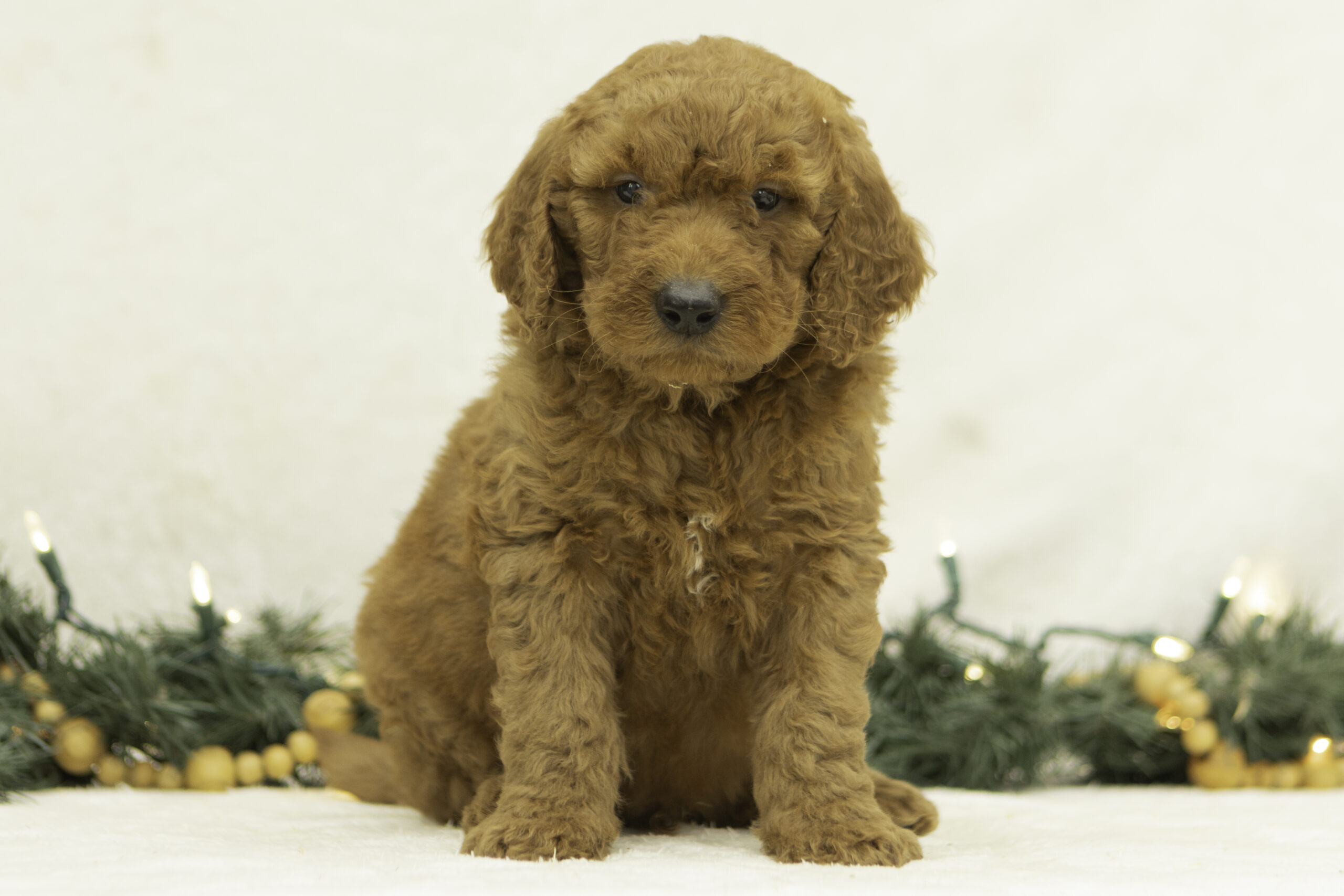 Sage is a 54-pound F1 Goldendoodle with a brilliant mind and a loving, patient nature. Outgoing and curious, she loves to explore her surroundings and make new friends. Her intelligence and gentle temperament make her a wonderful companion for families seeking a smart, affectionate, and adventurous dog.